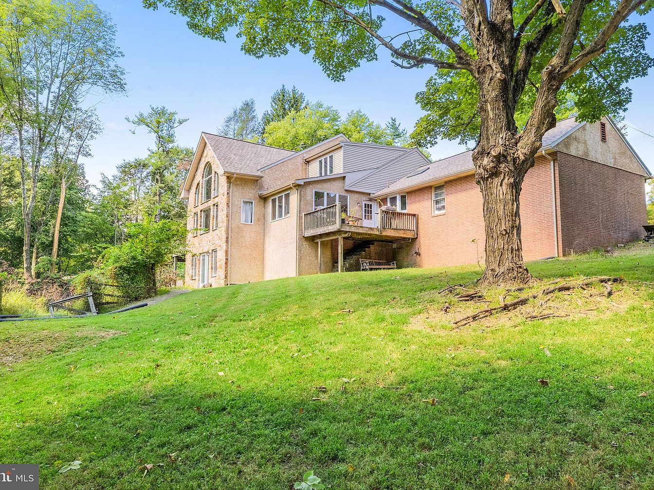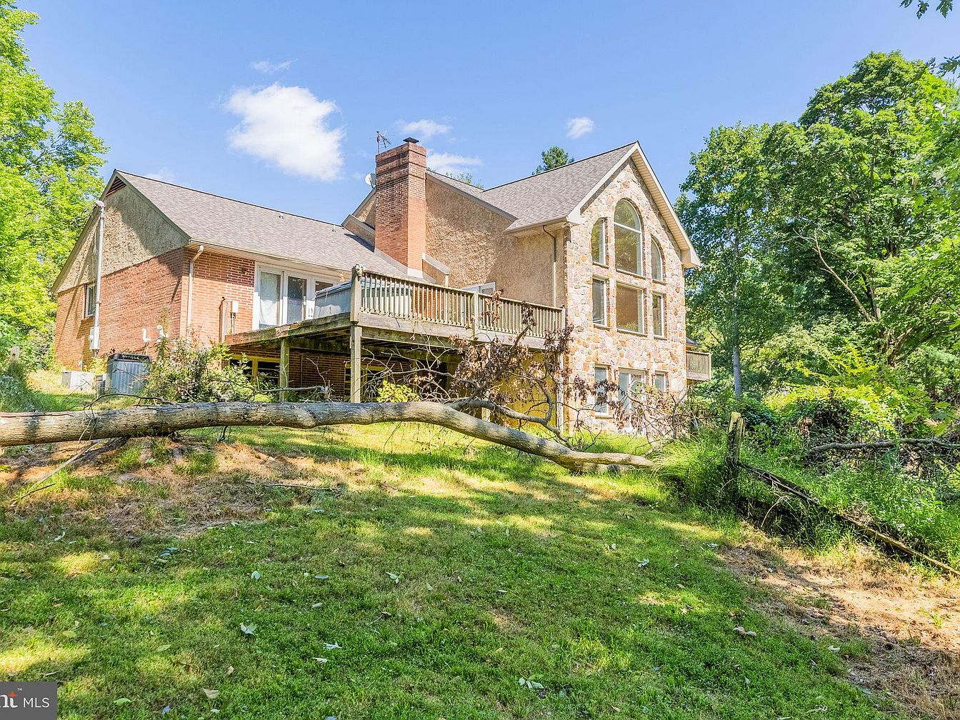 The exterior view showcases a two-story brick and stone house, blending modern and traditional architectural elements. A large deck extends from the upper level, ideal for outdoor entertaining. The facade features large windows framed in wood, allowing natural light to flood the interior. The house is surrounded by lush greenery, including tall trees and vibrant shrubs, enhancing the natural setting. A fallen tree lies across the yard, adding a rustic touch. The sloping lawn is well-maintained, with a mix of grass and dappled sunlight, creating a serene backdrop for the home.