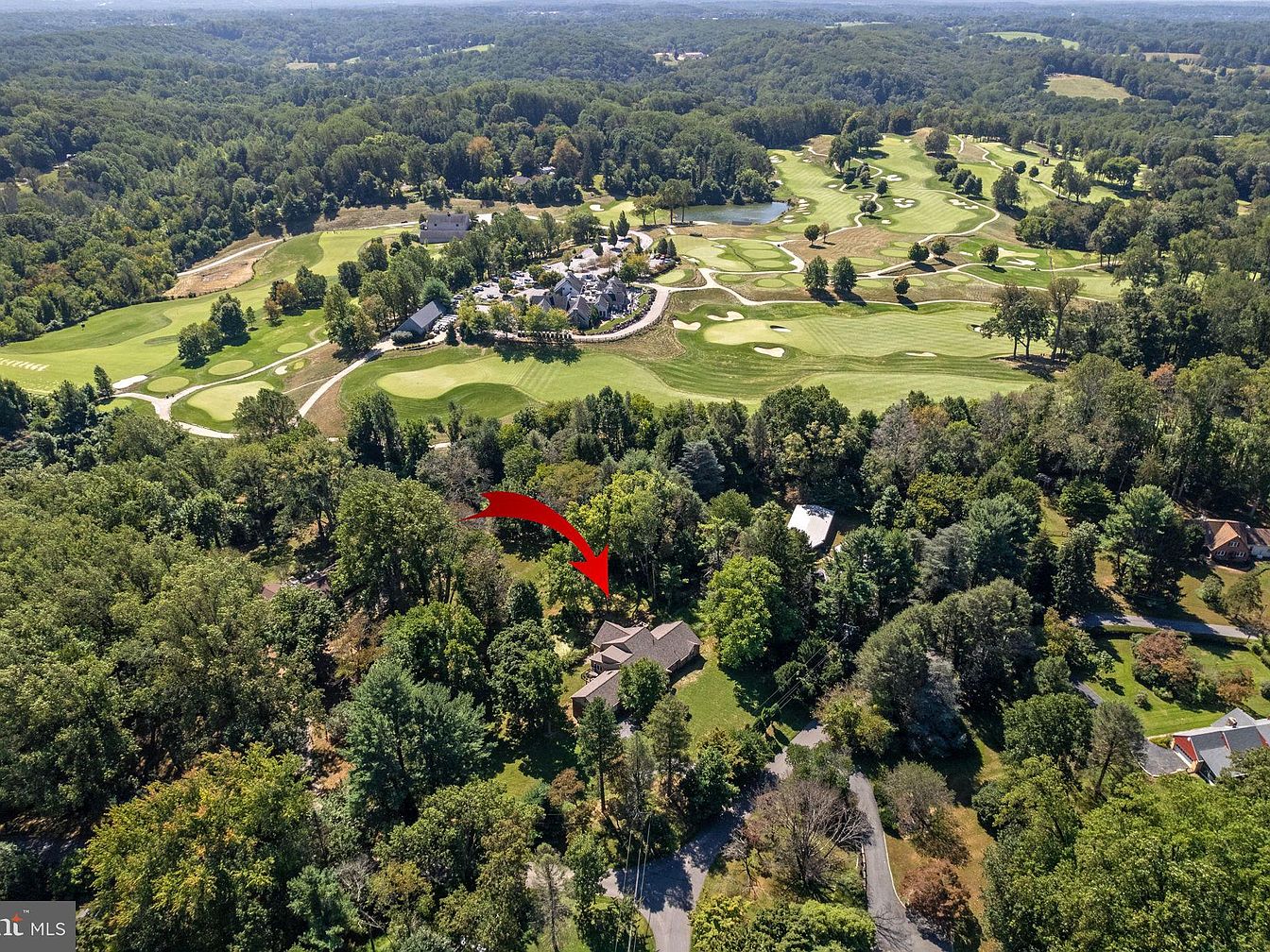This aerial perspective captures a beautiful, sprawling landscape surrounding a historic American home. The property is nestled among lush, mature trees, creating a serene and private atmosphere. A well-maintained golf course sprawls gracefully in the background, marked by rolling greens and winding cart paths. The home itself is partially obscured by foliage, featuring a traditional architecture style with a gabled roof and a blend of natural materials. Surrounding roads weave through the vibrant neighborhood, dotted with additional homes, each tucked among greenery, enhancing the charm of this idyllic setting. Overall, the scene reflects tranquility and natural beauty.