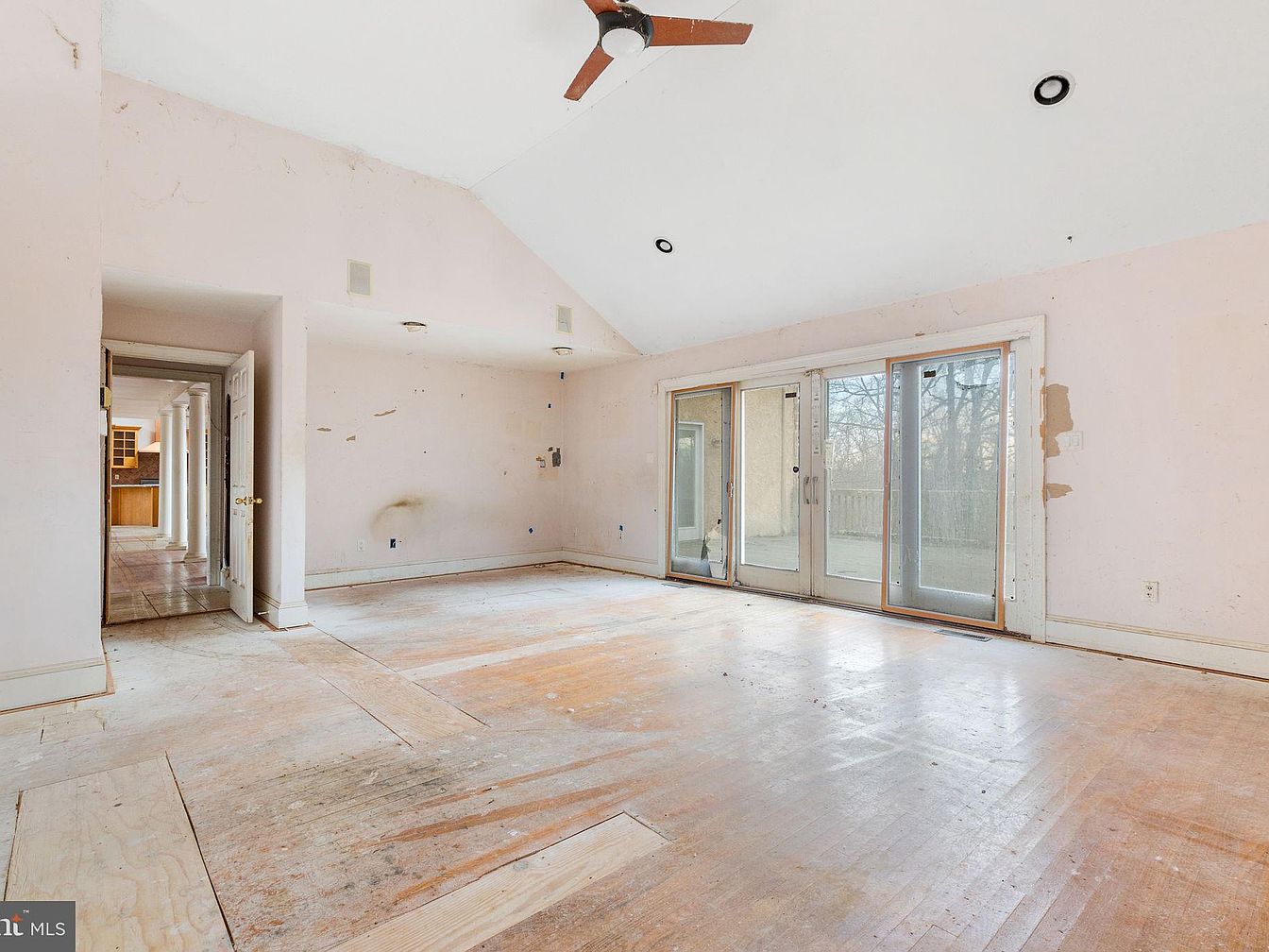 This spacious living room features an open layout with sloped ceilings that enhance verticality. Large glass doors lead to a balcony, allowing natural light to flood the space. The walls are painted a muted pink, showing signs of wear, with some peeling paint, indicating a need for restoration. The wooden floor, composed of wide planks, reflects a warm tone, though it appears unfinished in areas, exposing the raw wood beneath. A ceiling fan is mounted centrally, adding functionality. The visible hallway hints at a connected area, complementing the overall flow and accessibility of the home.