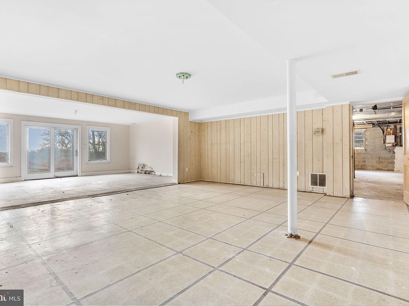 A spacious basement area features a mix of neutral tones with wooden paneling along the walls, creating a rustic yet unfinished atmosphere. The flooring consists of light-colored tiles arranged in a grid pattern, which adds structure to the open layout. Large sliding glass doors on one side invite natural light, contrasting with the minimalistic interior. A central white support column maintains architectural integrity, while the adjacent room shows exposed utility elements. This space offers potential for renovation, allowing for various functional uses such as a recreational area or additional storage.