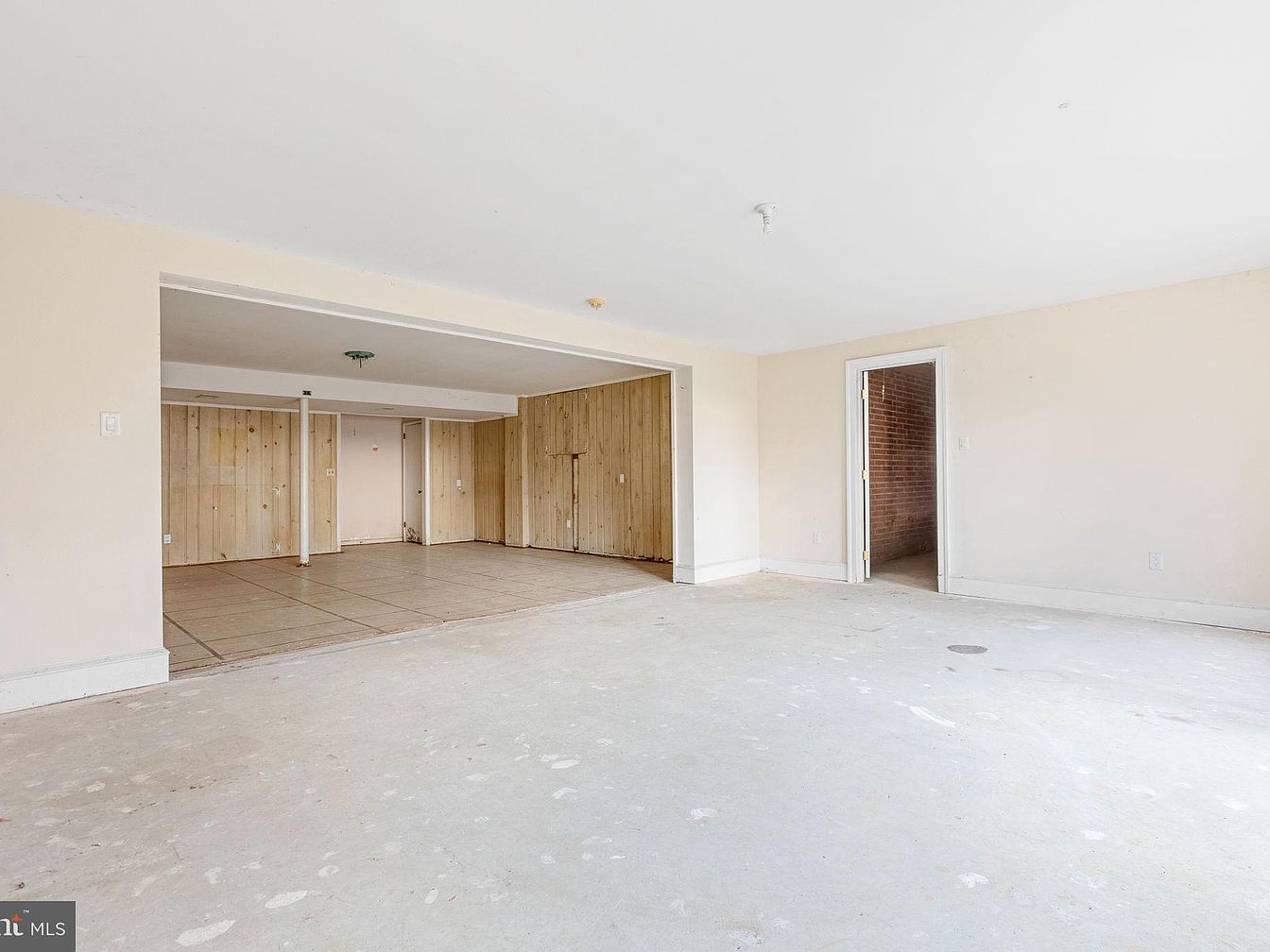 This space reflects a living room layout with a sense of openness. The floor is bare and unpolished, hinting at a need for renovation. Light beige walls contrast with the natural wood paneling at the back, showcasing a blend of simplicity and potential warmth. Architectural details include crisp white trim around doorways, adding a touch of classic elegance. An unfinished ceiling light fixture hangs above, suggesting opportunities for modern updates. Several doorways lead into adjacent areas, indicating connectivity within the home. Overall, the room invites creativity for both functionality and aesthetic improvements.