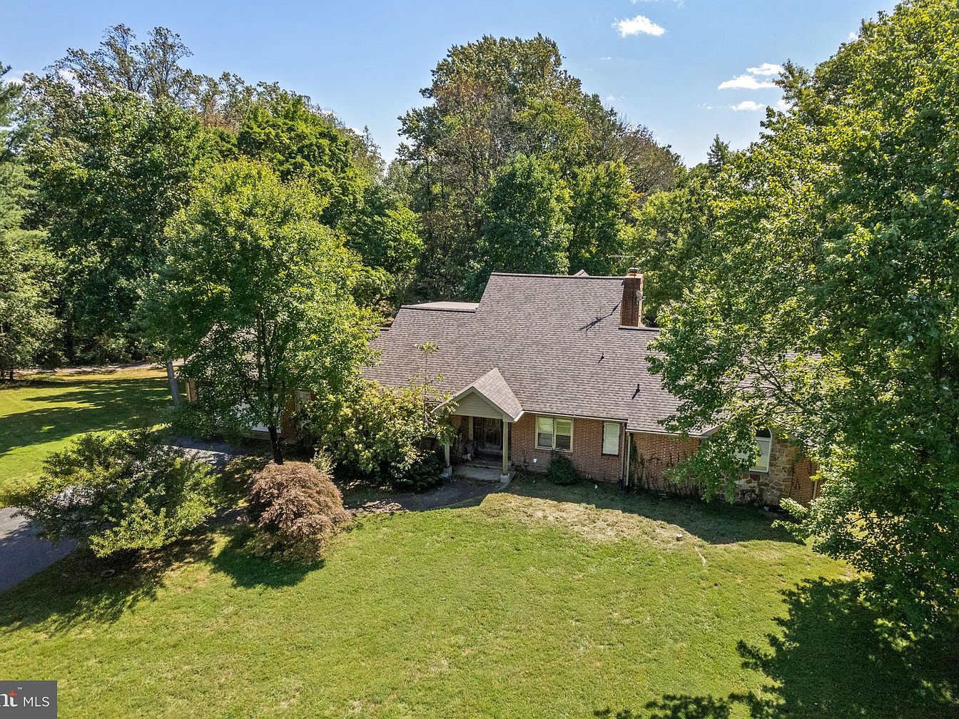 The image shows a spacious, historic American home enveloped by lush greenery. The house features a classic brick facade combined with a gabled roof, creating a harmonious and inviting appearance. Surrounding the structure, mature trees and manicured grass enhance the natural aesthetics. The driveway leads to a covered porch, adding to the welcoming charm. The moderate coloration of the roof complements the brick, while scattered bushes contribute to the landscape’s texture. The setting indicates a tranquil suburban atmosphere, perfect for outdoor living and enjoying nature, further emphasized by the clear blue sky above.