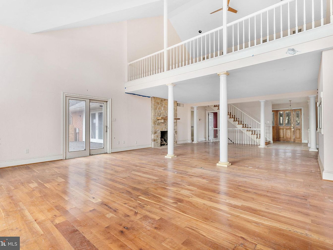An expansive living room showcases an open layout with high ceilings, emphasizing a sense of airy spaciousness. Natural light filters through large sliding glass doors, creating a bright atmosphere. The walls are painted a soft pastel hue, enhancing the tranquility of the space. Exposed wooden flooring adds warmth, while white pillars define the structural elements, contributing a classic touch. A stone fireplace serves as the focal point, merging rustic charm with modern design. A visible staircase in the background leads to an upper level, adding depth and functionality to the layout, promoting an inviting transitional feel.