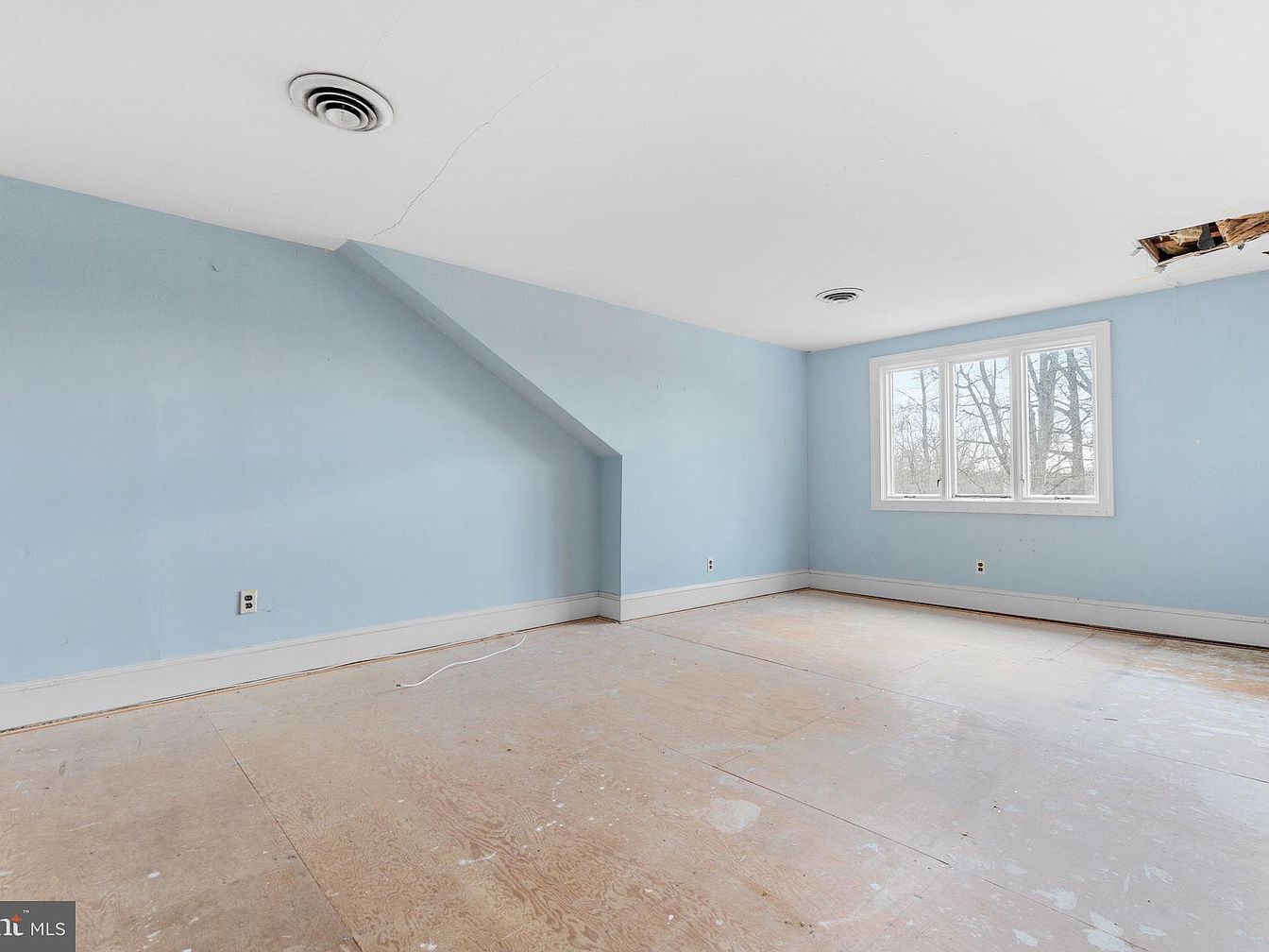 This space features light blue walls that evoke a serene atmosphere, complemented by a stark white ceiling. The room has a distinct angled ceiling at one end, creating a cozy nook. A large window allows natural light to filter in, providing a view of the outdoors and enhancing the spacious feel. The flooring is bare, revealing an unfinished wooden base, which can be styled according to preference. Architectural details include simple white trim around the window and floor, adding to the room’s understated elegance. The overall aesthetic sits between modern minimalism and traditional charm.