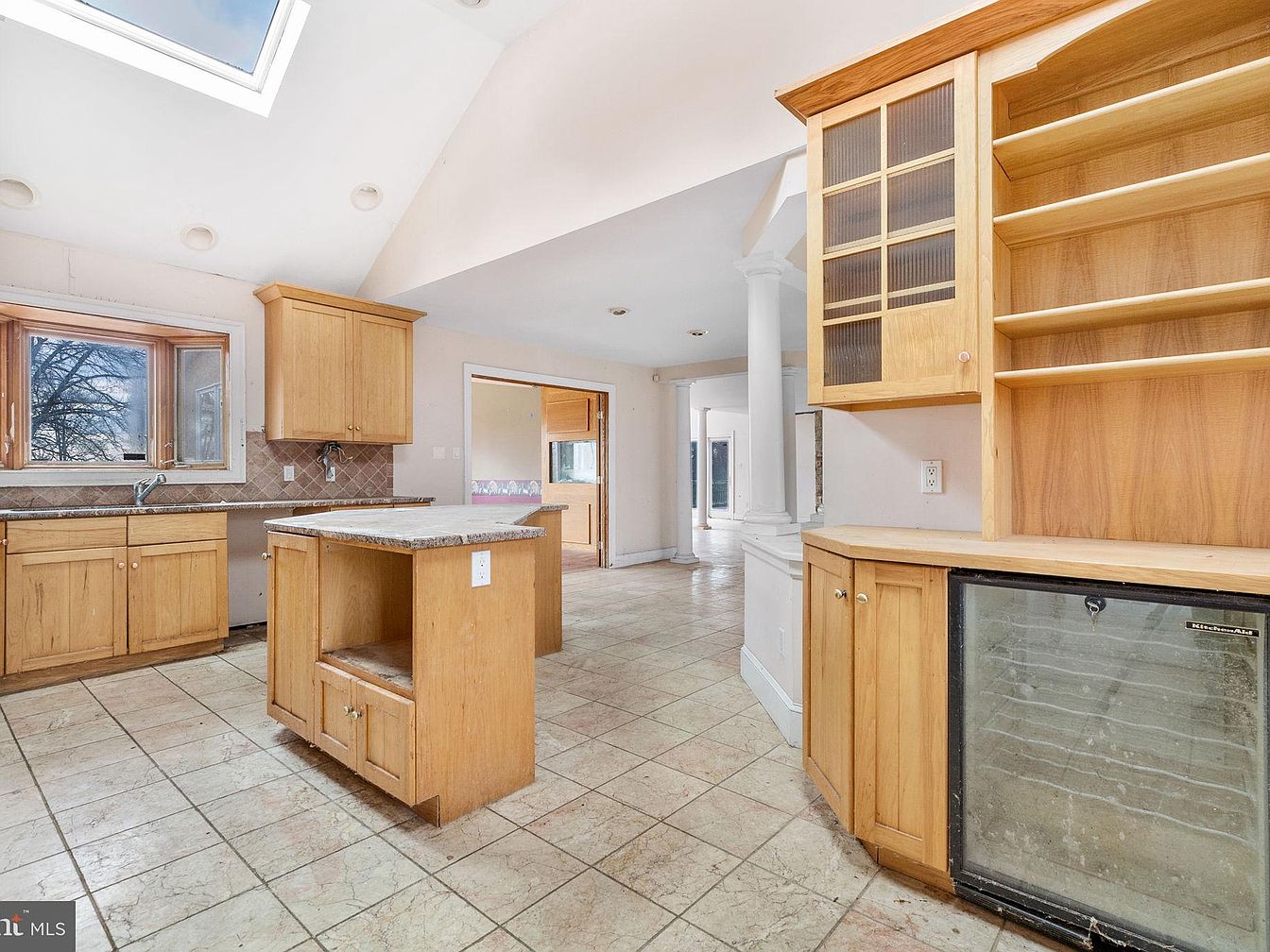 This kitchen features a spacious layout with an open concept design, revealing a combination of rustic charm and modern functionality. Light wooden cabinetry complements the earthy-toned tiled flooring, while a central island adds convenience and an extra workspace. Large windows provide ample natural light, enhancing the airy feel of the room. A built-in wine fridge is seamlessly integrated into the cabinetry, showcasing practicality. The vaulted ceiling adds a sense of height, further amplifying the openness. Neutral color tones, paired with natural wood finishes, create a warm and inviting atmosphere, perfect for family gatherings or entertaining guests.