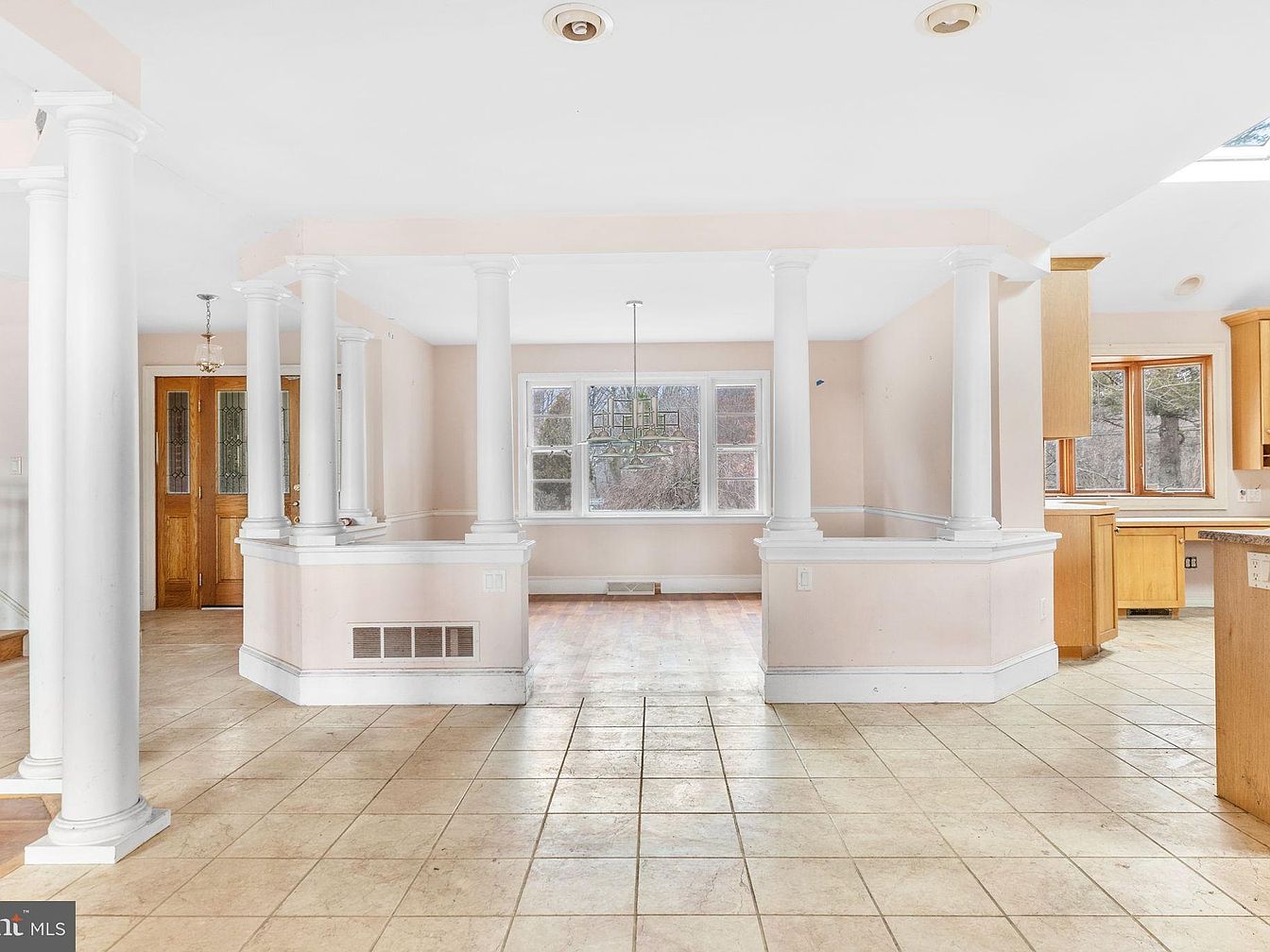 This open-concept dining area features tall white columns that define the space while allowing for an airy feel. The walls are painted in a soft pastel hue, enhancing the light and spacious ambiance. A large window invites natural light, illuminating the tiled floor patterned in a neutral tone. On the left, a wooden door with glass panels adds character, complemented by a simple chandelier overhead. The adjacent kitchen showcases wooden cabinetry, providing a warm contrast to the pale walls. Overall, the aesthetics blend classic elements with a modern layout, fostering a welcoming atmosphere for gatherings.