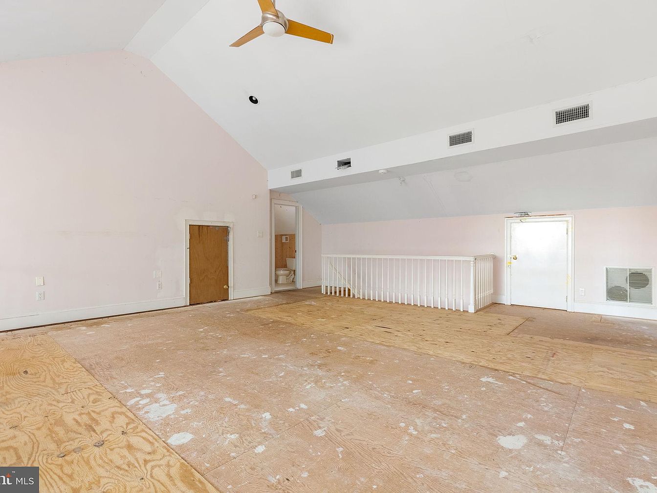 This loft area features a vaulted ceiling with exposed beams, enhancing the openness of the space. The walls are painted a soft pink, creating a warm and inviting atmosphere, while the wooden floors remain unfinished, adding a rustic touch. A ceiling fan circulates air effectively, and light filters through the space from a nearby door. The design includes a small hidden door, suggesting additional storage or an attic entrance. Light-colored railings define the loft’s boundaries, offering safety while maintaining visibility. Overall, the room presents a cozy yet expansive feeling, ideal for creative use.