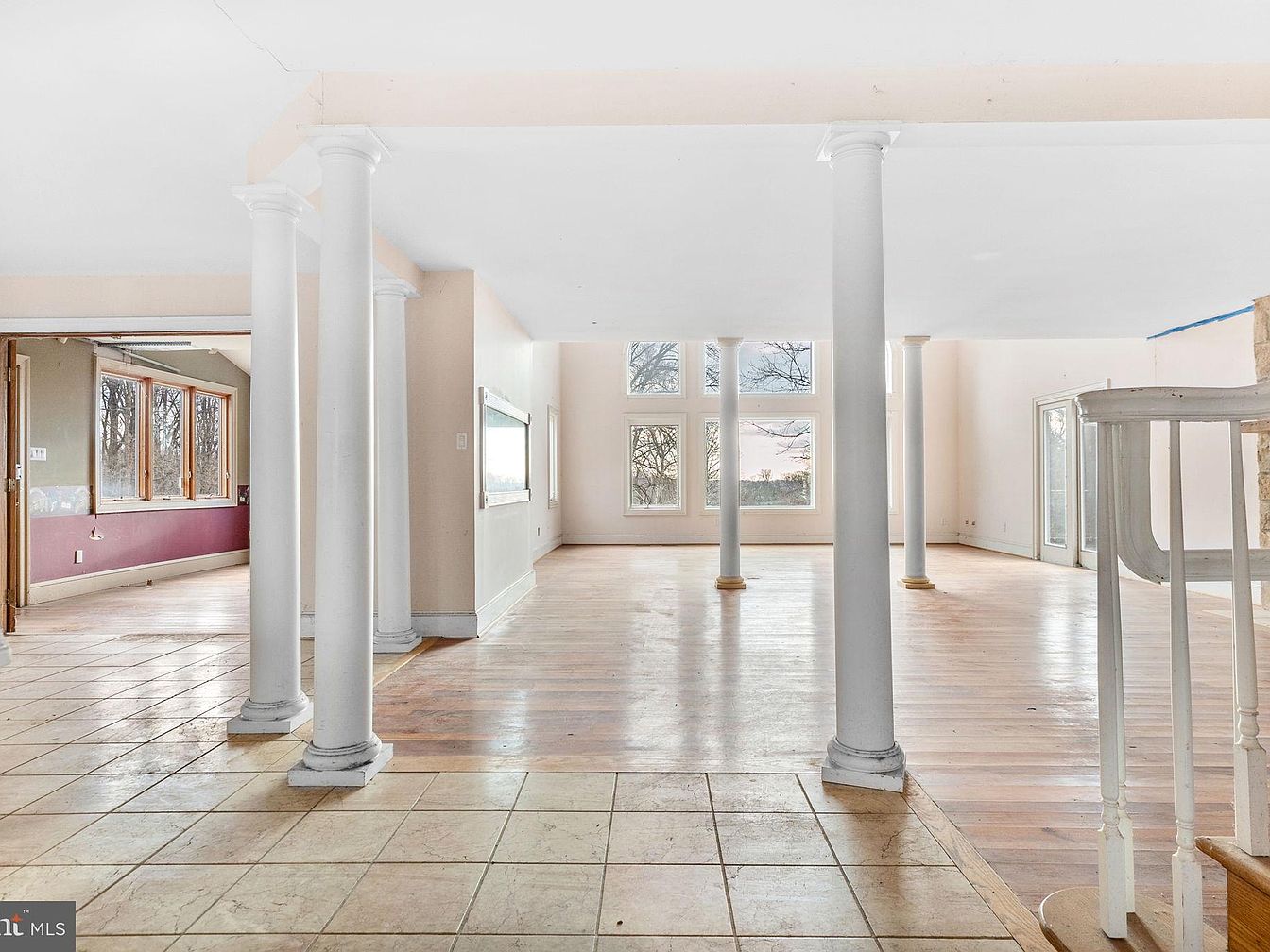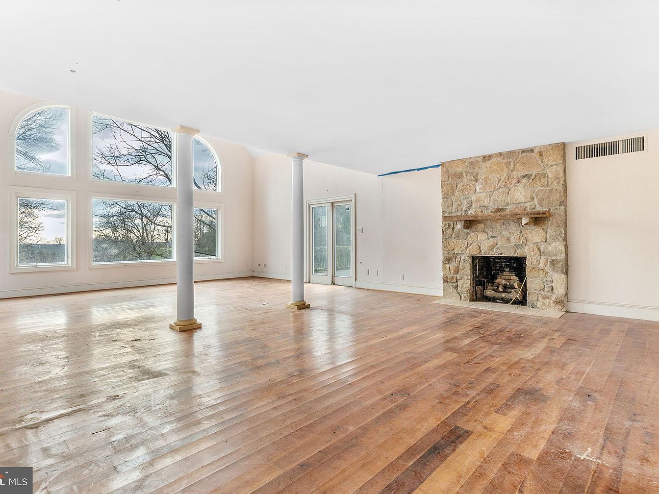 A spacious living room characterized by large, arched windows that allow abundant natural light, illuminating the warm wooden floor. The layout features two prominent white columns supporting the ceiling, adding elegance and a sense of openness. A stone fireplace with a rustic wooden mantel serves as a focal point, juxtaposing the light color of the walls. The color scheme remains neutral, enhancing the airy atmosphere. Subtle architectural details, such as the baseboards and molding, complement the room’s classic style. An adjacent door leads outside, emphasizing a connection with nature and inviting fresh air into the space.