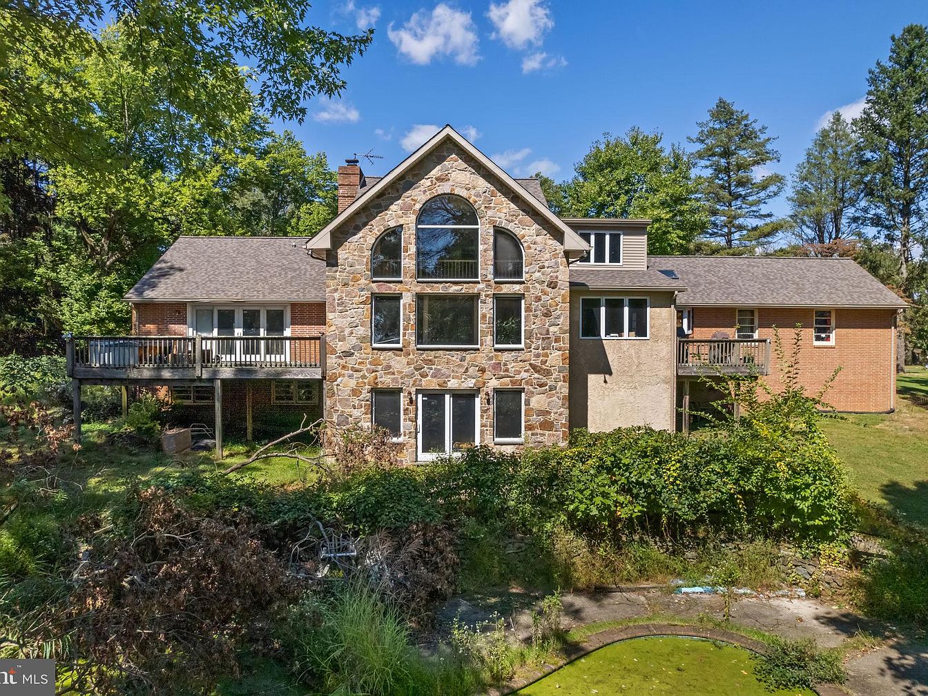The image shows a spacious outdoor view of a historic American home, featuring a unique combination of stone and brick architecture. Prominent is the large stone facade with tall, arched windows that invite natural light, complemented by a contrasting, lower brick structure. A wooden deck extends from one side, providing an outdoor living area, while the surrounding landscape is lush with greenery, including trees and shrubs. The roof is a traditional gable design, harmonizing with the home’s overall aesthetic. The property, partially obscured by overgrown foliage, adds a sense of rustic charm and inviting tranquility.