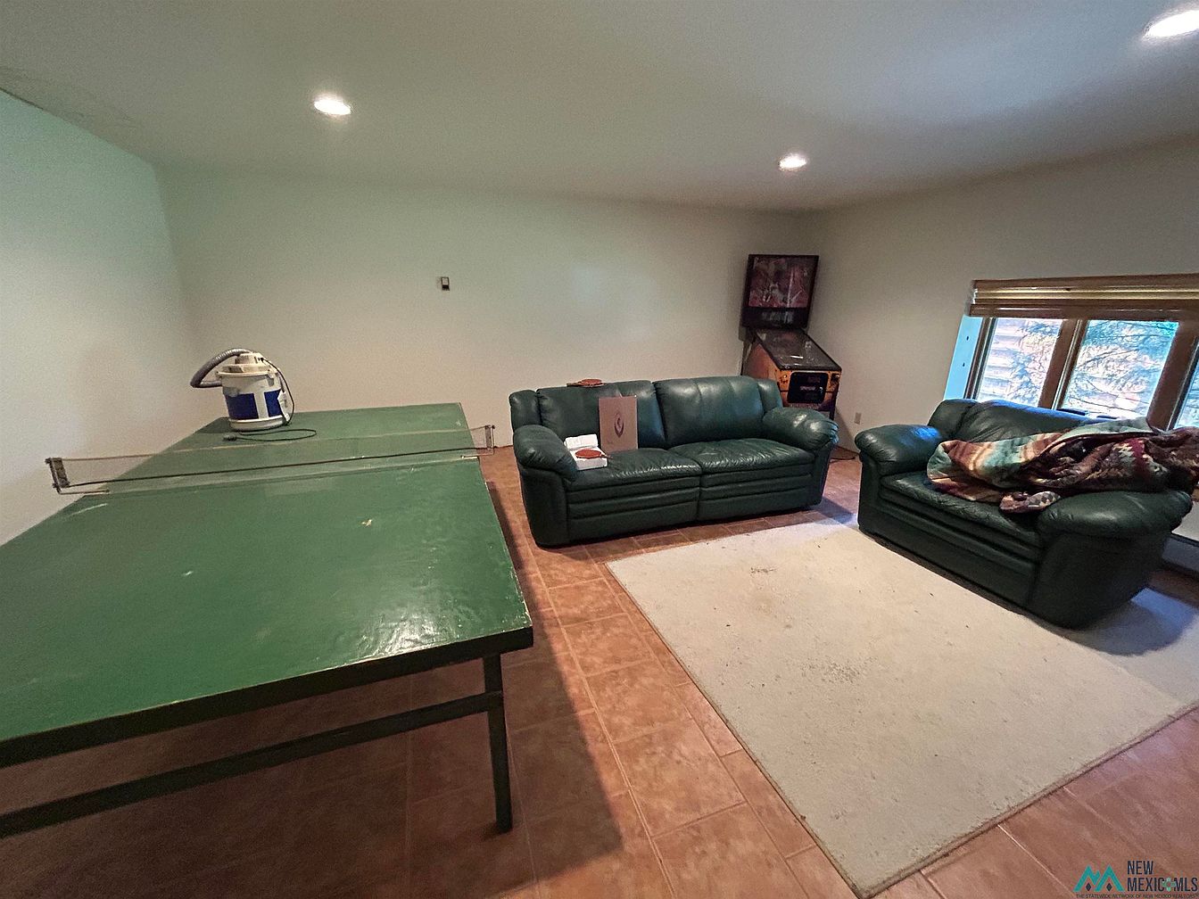 A cozy family room features two dark green leather sofas arranged in a welcoming manner, encouraging relaxation. A light-colored area rug contrasts with the tan tiled flooring, adding warmth to the space. A large green table dominates one side, likely intended for games or crafts, with a vacuum cleaner resting nearby, hinting at ongoing tidying. Natural light pours in through windows adorned with wooden blinds, illuminating the room’s simple design. An arcade machine in the corner suggests a playful atmosphere, while the soft wall color creates a calm backdrop, enhancing the room’s inviting aesthetic.