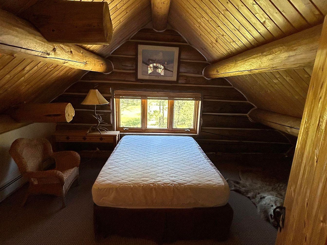 A cozy loft bedroom featuring a sloped wooden ceiling with exposed beams and log walls, enhancing its rustic aesthetic. Natural light streams through a small window, framing a natural vista outside. A simple bed with a quilted white mattress occupies the center, complemented by a rustic wooden headboard. A small wooden nightstand holds a stylish lamp, adding a functional touch. In the corner, a woven armchair invites relaxation. The floor is carpeted, softening the wooden elements and providing comfort. This intimate space blends traditional craftsmanship with natural charm, ideal for restful retreats.