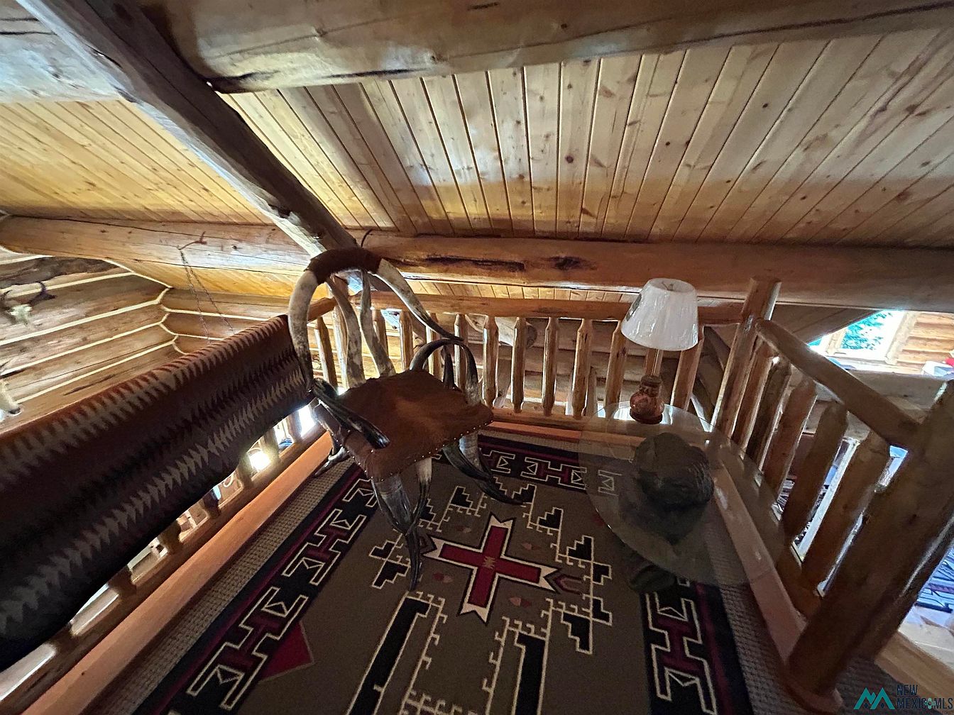 This loft area features natural wood beams and a warm wooden ceiling, enhancing the rustic charm. A unique, hand-crafted chair made from antlers adds character. A woven blanket drapes over a low bench, bringing texture and color to the space. The floor is adorned with a geometric patterned rug that complements the earthy tones. A glass-topped table sits beside a lamp with a ceramic base, providing soft illumination. The wooden railing opens up to the lower level, inviting light and enhancing the airy feel. The overall atmosphere is cozy and inviting, perfect for relaxation.