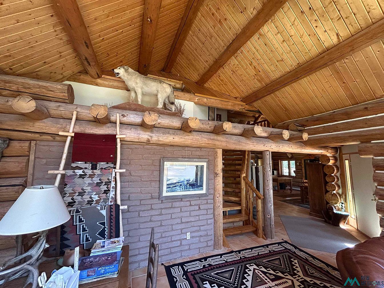 This spacious living room features stunning wooden beams that span the vaulted ceilings, creating an open and warm atmosphere. The natural log walls exhibit a rustic charm, while a large, cozy area rug in rich, earthy tones anchors the seating space. Adjacent to a light-colored wall, a ladder foxes its place near a hanging textile, adding visual interest. A mounted wolf sculpture on a ledge evokes a sense of wilderness connection. Directly opposite, a staircase leads to an upper level, inviting exploration, while a few well-placed windows allow natural light to flood the area, enhancing the inviting ambiance.