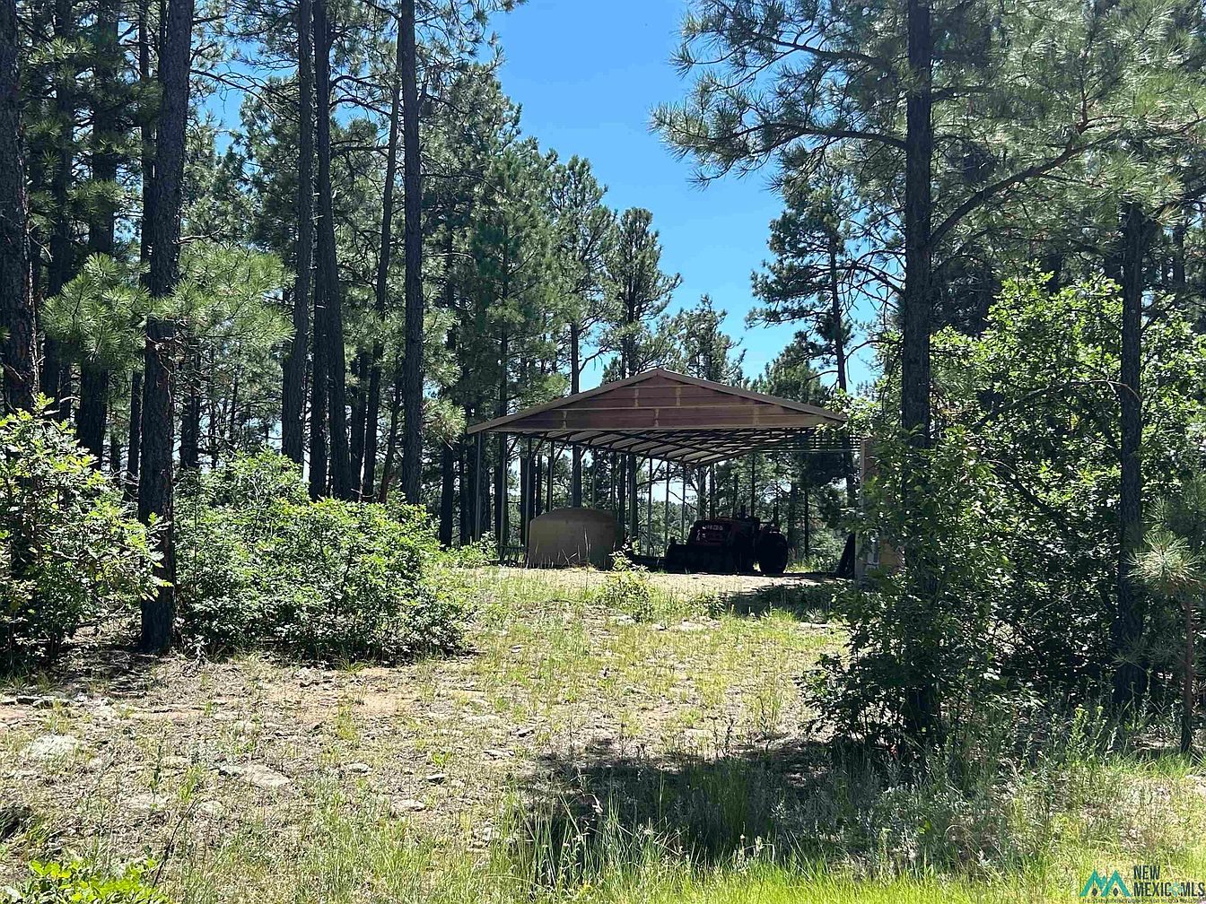 This space features a spacious, open carport nestled among tall pine trees, offering a blend of utility and nature. The structure has a wooden frame and a gabled roof, allowing light to filter through while providing shelter. The ground is covered in natural grass and scattered rocks, enhancing the rustic feel. Surrounding the carport are lush shrubs and various foliage that add greenery to the landscape. A vintage tractor rests under the open structure, hinting at a practical use for outdoor activities. The bright blue sky and the dappled sunlight create a serene, picturesque environment.