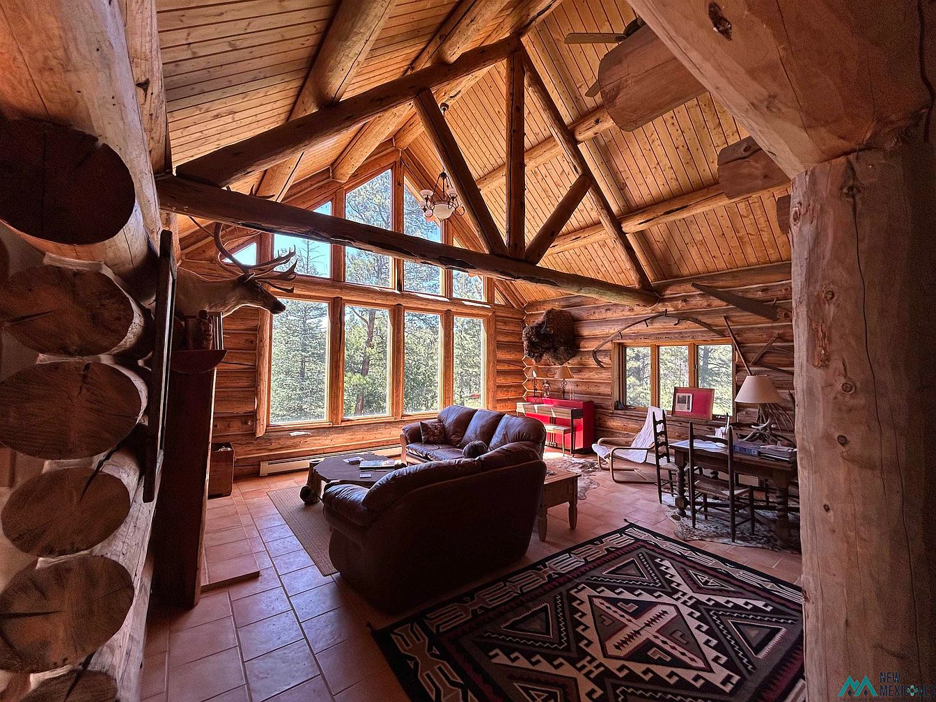 A rustic living room featuring soaring wooden ceilings supported by thick log beams. The space is illuminated by large, multi-paned windows that frame views of the surrounding nature, creating an inviting atmosphere. Earthy tones dominate the color palette, with deep browns from the logs contrasting with the light wood of the ceiling. A plush leather sofa and patterned area rug add comfort and warmth. A sturdy wooden coffee table serves as the centerpiece, accompanied by a lamp and a vintage chair. Decorative elements, like antlers and a mounted moose head, enhance the cabin’s rustic charm.