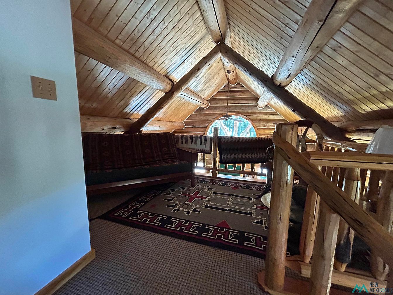 A cozy loft area features exposed wooden beams and a high, sloped ceiling giving a rustic charm. The warm, honey-colored wood throughout creates an inviting atmosphere. A dark, patterned rug adds a touch of color and texture beneath a simple wooden bench with a dark green cushion for comfort. Natural light filters through a large, round window, enhancing the space’s openness. Adjacent to the seating area, a wooden railing provides safety while maintaining the airy feel. The soft, neutral walls contrast with the vibrant rug, ensuring a harmonious blend of textures and colors in this serene retreat.