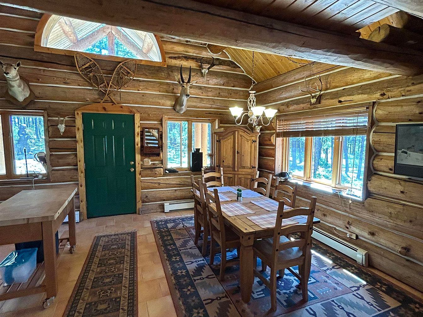 This rustic dining area showcases a warm, inviting atmosphere with wooden log walls and a high, slanted ceiling. A large, sturdy wooden table stands center stage, surrounded by matching chairs, enhancing the country-chic vibe. The color palette consists of natural wood tones complemented by earthy accents. A striking green front door provides a pop of color, while adorned walls display mounted animal heads and traditional snowshoes, adding to the rustic charm. Large windows invite soft natural light, illuminating intricate woven rugs on the terracotta-tiled floor, creating a cozy yet spacious feel, perfect for family gatherings.