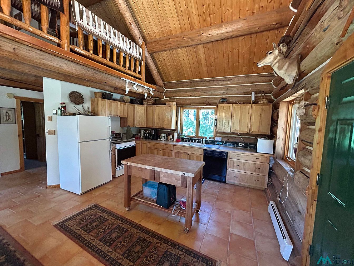A rustic kitchen embraces a cozy, log cabin aesthetic. Rich wooden cabinetry and exposed beams contribute to the warm ambiance, while large windows allow natural light to illuminate the space. The flooring features terracotta tiles, providing a charming contrast to the wooden tones. A central island with a butcher block top serves as a cooking area, surrounded by modern appliances, including a white refrigerator and black dishwasher. Accents of nature are displayed through taxidermy mounts on the walls. The green door adds a pop of color, enhancing the inviting, homey feel within this welcoming kitchen.