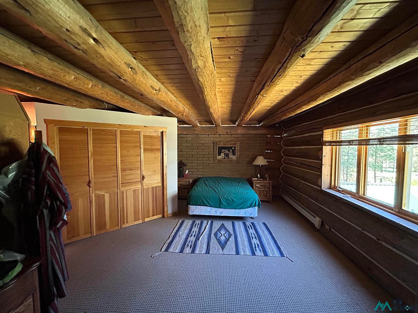 A cozy bedroom features classic log cabin aesthetics, with exposed wooden beams that gracefully span the ceiling. The walls display a mix of log and smooth brick, contributing to a warm, rustic atmosphere. A green bedspread covers the bed, providing a serene focal point, while wooden furniture complements the natural theme. A woven area rug adds texture beneath the bed, enhancing comfort. Closet doors crafted from light wood contrast with the darker tones of the logs, framing the space elegantly. Multiple windows allow natural light to flood in, creating an inviting, tranquil environment perfect for relaxation.