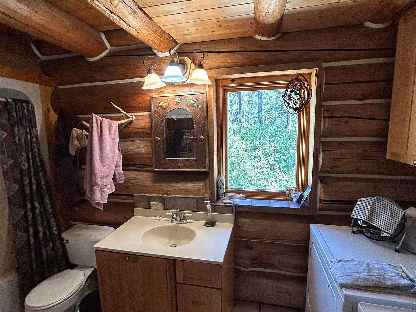 This rustic bathroom features rough-hewn log walls that create a warm, cabin-like atmosphere. A light-colored countertop complements wooden cabinetry, providing a natural contrast. Above the sink, a unique, decorative mirror hangs, illuminated by rustic-style light fixtures with soft bulbs, casting a cozy glow. Fresh towels are casually draped over a wooden towel rack, adding practical charm. A compact window offers a serene view of the outdoors, enhancing the space with natural light and greenery. The arrangement of fixtures, including a toilet and a washing machine, showcases efficient use of space while maintaining the aesthetic coherence of the room.