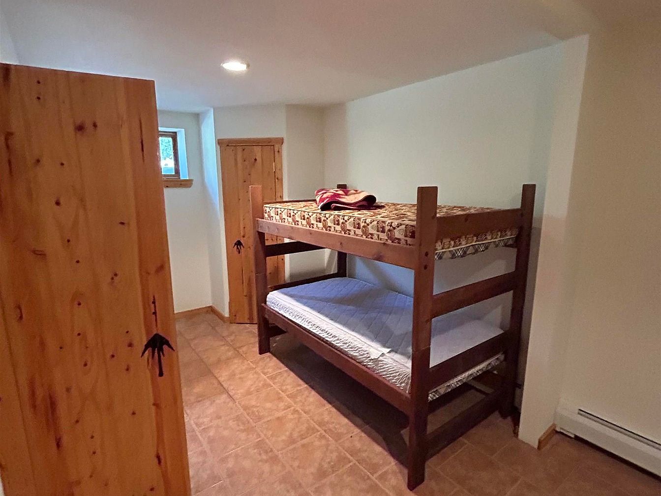 A cozy bunk room with a natural wood aesthetic features a sturdy, handcrafted wooden bunk bed positioned against a soft beige wall. The upper bunk has a floral-patterned mattress adorned with a red blanket, while the lower bunk is prepared with a simple white mattress. Terracotta tile flooring extends across the space, enhancing the rustic charm. Two wooden doors, likely closets, are prominently showcased; one features an intricate carving of a tree. Natural light filters through a small window, providing warmth and drawing attention to the earthy tones, perfect for a welcoming retreat.