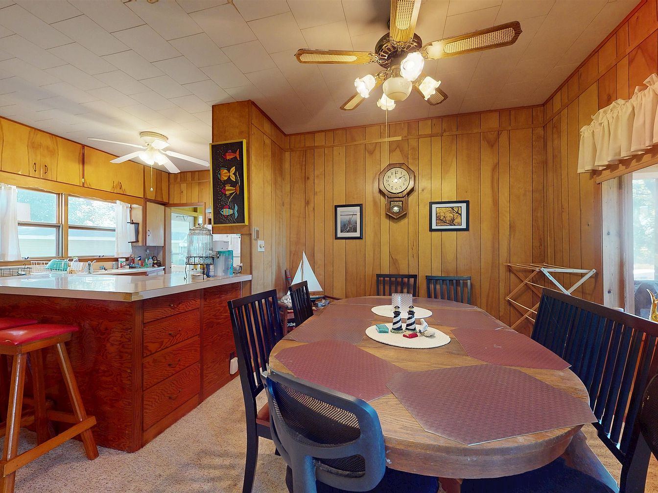 A cozy dining area sits adjacent to an open kitchen, unified by warm wood-paneled walls and a vintage, mid-century charm. The dining table is oval with a natural wood finish, surrounded by black chairs, and topped with coordinating placemats and a whimsical lighthouse centerpiece. The kitchen features red-toned wood cabinetry, a spacious countertop with two red barstools, and ample natural light from three large windows above the sink. Ceiling fans with brass accents add a nostalgic touch, along with a wall-mounted clock, framed photos, and nautical-themed decor, creating a welcoming and homey atmosphere.