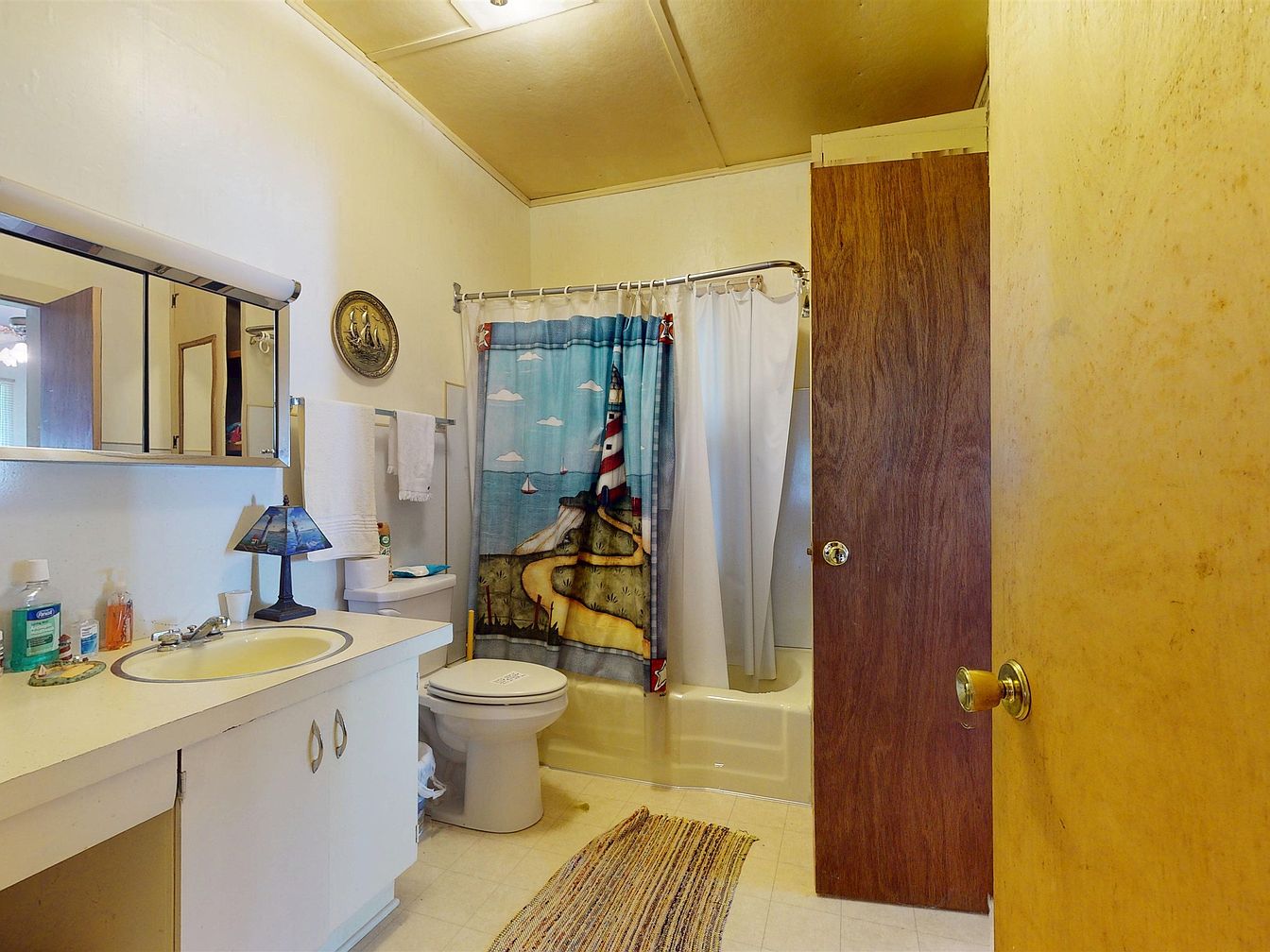 A modest bathroom with vintage charm features light cream walls and a matching ceiling. The counter is a laminate material with a cream-colored sink and silver fixtures, set in white cabinetry with simple handles. A mirrored medicine cabinet runs above the sink, accompanied by everyday toiletries. A nautical-themed lamp sits to the left of the sink, and a round decorative ship’s plaque hangs above the towel rack. The shower area is enclosed by a curtain depicting a lighthouse with clouds and sailboats, adding a coastal touch. The floor is covered with linoleum and complemented by a striped, earth-tone rug, creating a cozy, lived-in feel.