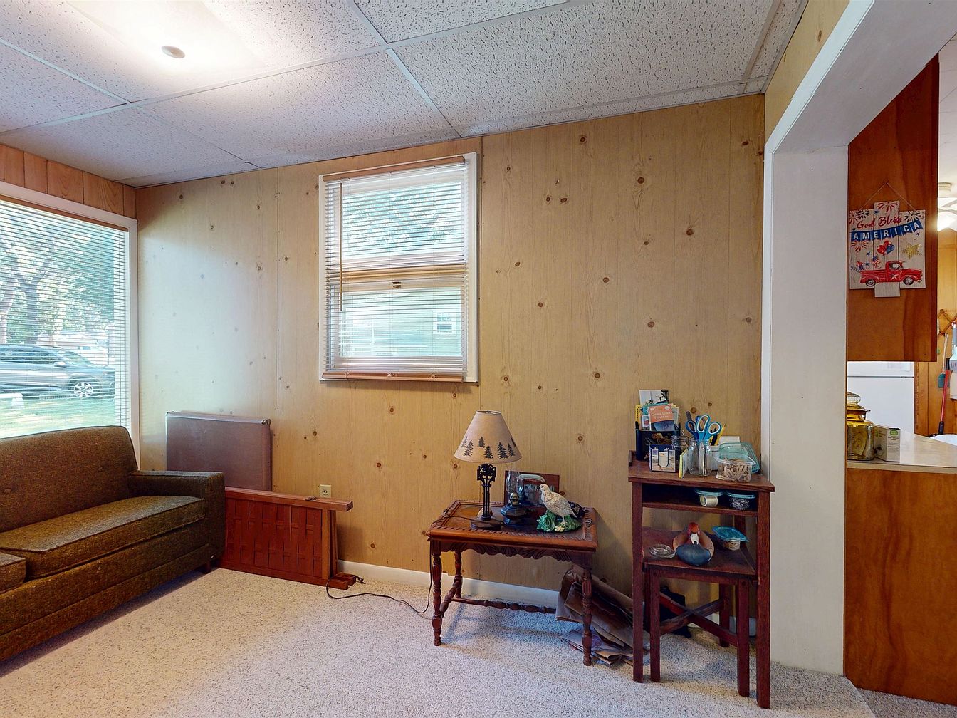This cozy living room features wood-paneled walls with a light, honey-brown finish, dotted with knots for a rustic effect. A simple green vintage sofa sits beneath a large window, flooding the space with natural light and giving a view to the front yard. The carpet is a light beige, complementing the warm wood tones. Two dark wooden tables occupy the corner, one supporting a lamp with a patterned shade and various decorative objects including figurines and jars. A pass-through opening in the wall leads to the kitchen, maintaining a sense of openness in this small, inviting space.