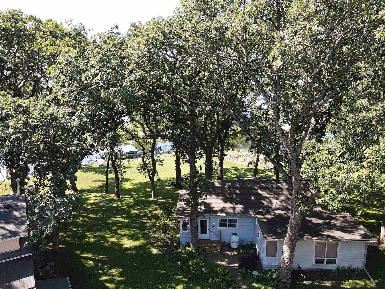 A cozy single-story house with a light exterior sits nestled under a canopy of mature trees, providing dappled shade over the lawn. The front yard is lush, with well-kept grass and some low, leafy bushes framing the house. Wide windows and a modest entryway give the home a welcoming feel. The yard opens towards a scenic waterfront in the background, where a dock and boat lift can be seen at the edge of the property. Natural light filters through the leaves, adding a tranquil, secluded atmosphere to the outdoor space.