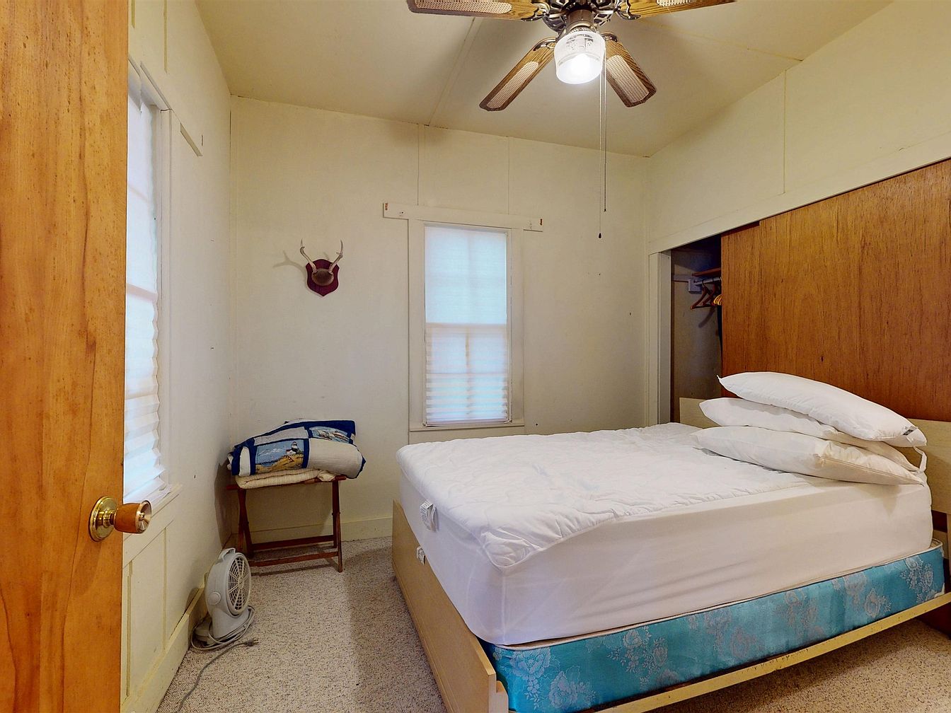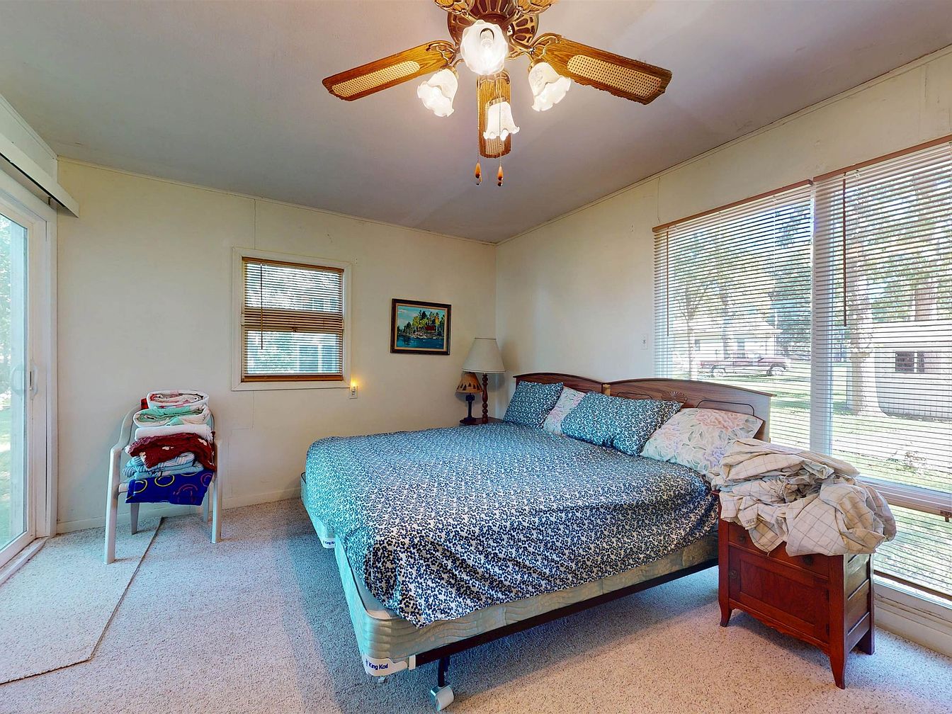 A cozy bedroom with a large bed covered in a blue and white patterned bedspread takes center stage, flanked by mismatched pillows. The room features white walls, cream carpeting, and generous windows along two walls, allowing plentiful natural light and offering views of the neighborhood and yard. Blinds are partially closed to filter sunlight. A classic wooden nightstand sits beside the bed, topped with a folded pile of linens. On the opposite side, a white plastic chair supports neatly stacked blankets. A ceiling fan with vintage brass and wood accents and frosted glass light shades hangs overhead, complementing simple, functional decor.