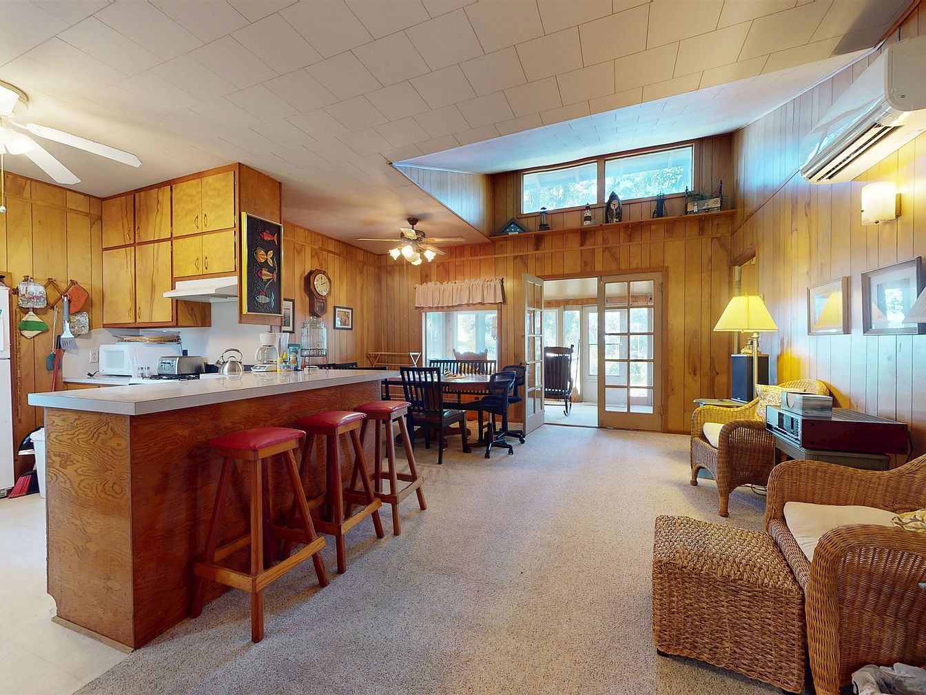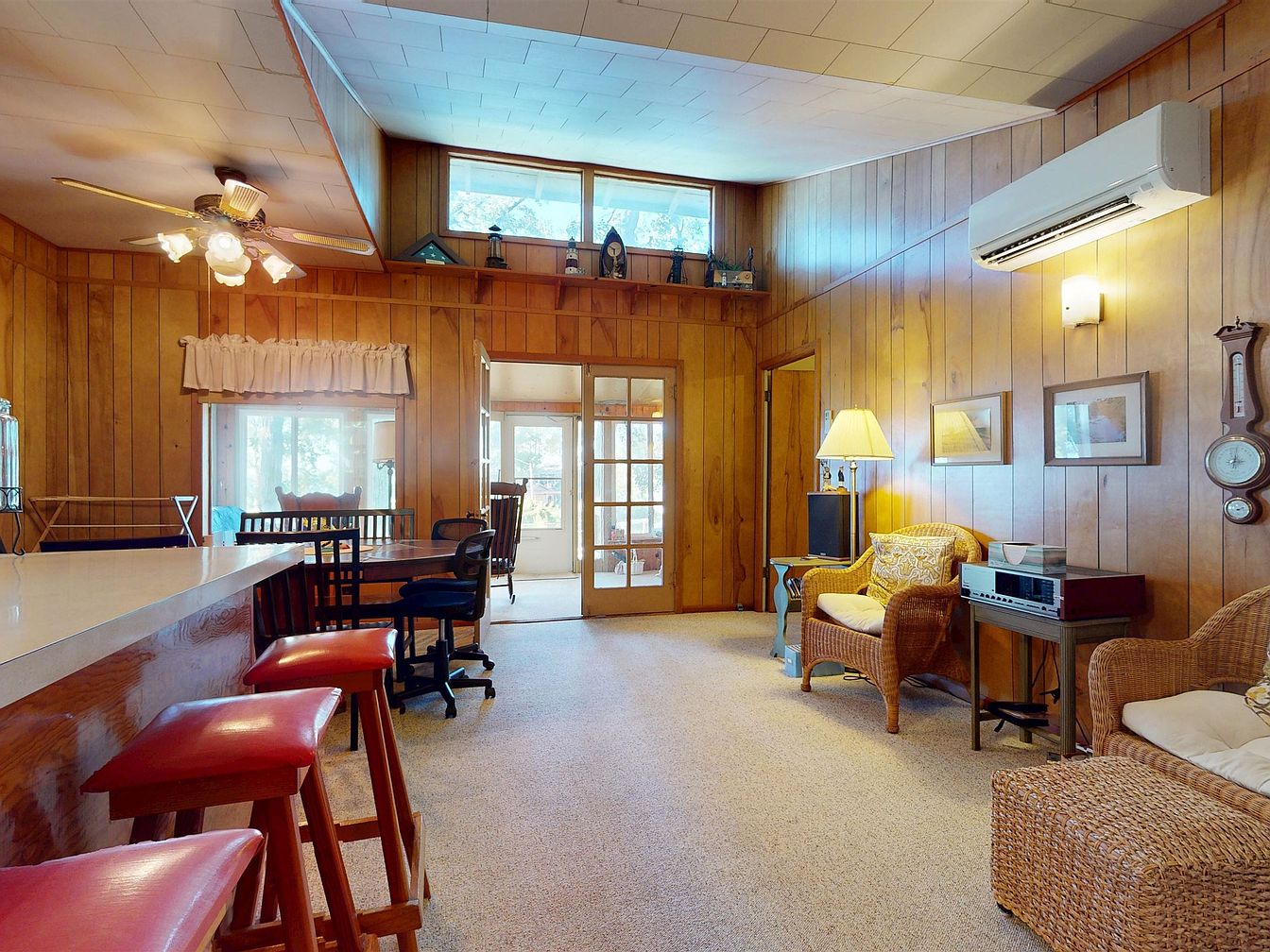 A cozy living room combines mid-century and rustic elements, featuring warm wood paneling across the walls and ceiling. Light gray carpet covers the floor, adding comfort to the space. Rattan armchairs and a matching ottoman with cream cushions sit near a floor lamp, creating a relaxed reading nook. Tunes play from a vintage stereo system on a side table. Red-cushioned bar stools line the breakfast bar, facing a wooden dining table underneath a ceiling fan. Wall-mounted decor includes clocks and framed art, while upper windows and a French door fill the room with soft, natural light.