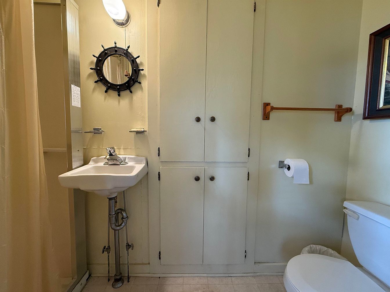 A small, vintage-inspired bathroom featuring a wall-mounted rectangular white sink with exposed plumbing. Above the sink is a nautical-style round mirror bordered with dark spokes, evoking a ship’s wheel. The walls and built-in cabinetry are painted in a soft cream color, enhancing the room’s light and airy atmosphere. A simple wall-mounted light fixture sits over the mirror, casting gentle illumination. To the right, a classic white toilet sits beneath a wooden towel rack and a toilet paper holder. Touches like the cream shower curtain, built-in linen cabinet, and framed art add to the understated, utilitarian charm.