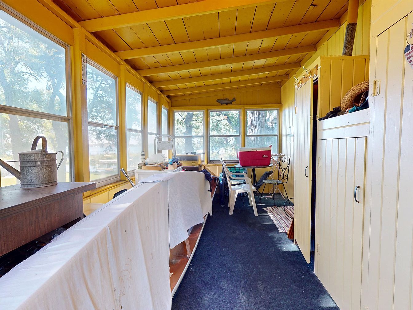 Long, enclosed sunroom with bright yellow wooden walls and ceiling, filled with natural light from large windows along one side. The space is lined with built-in storage closets and shelves, and a dark carpet runs the length of the floor. Plastic patio chairs, a red cooler, and small tables are arranged toward the far end, suggesting a casual gathering or utility area. Farmhouse touches include a vintage metal watering can and rustic accessories. The space feels cozy yet functional, with slightly cluttered surfaces and an inviting view of greenery and trees just outside the windows.