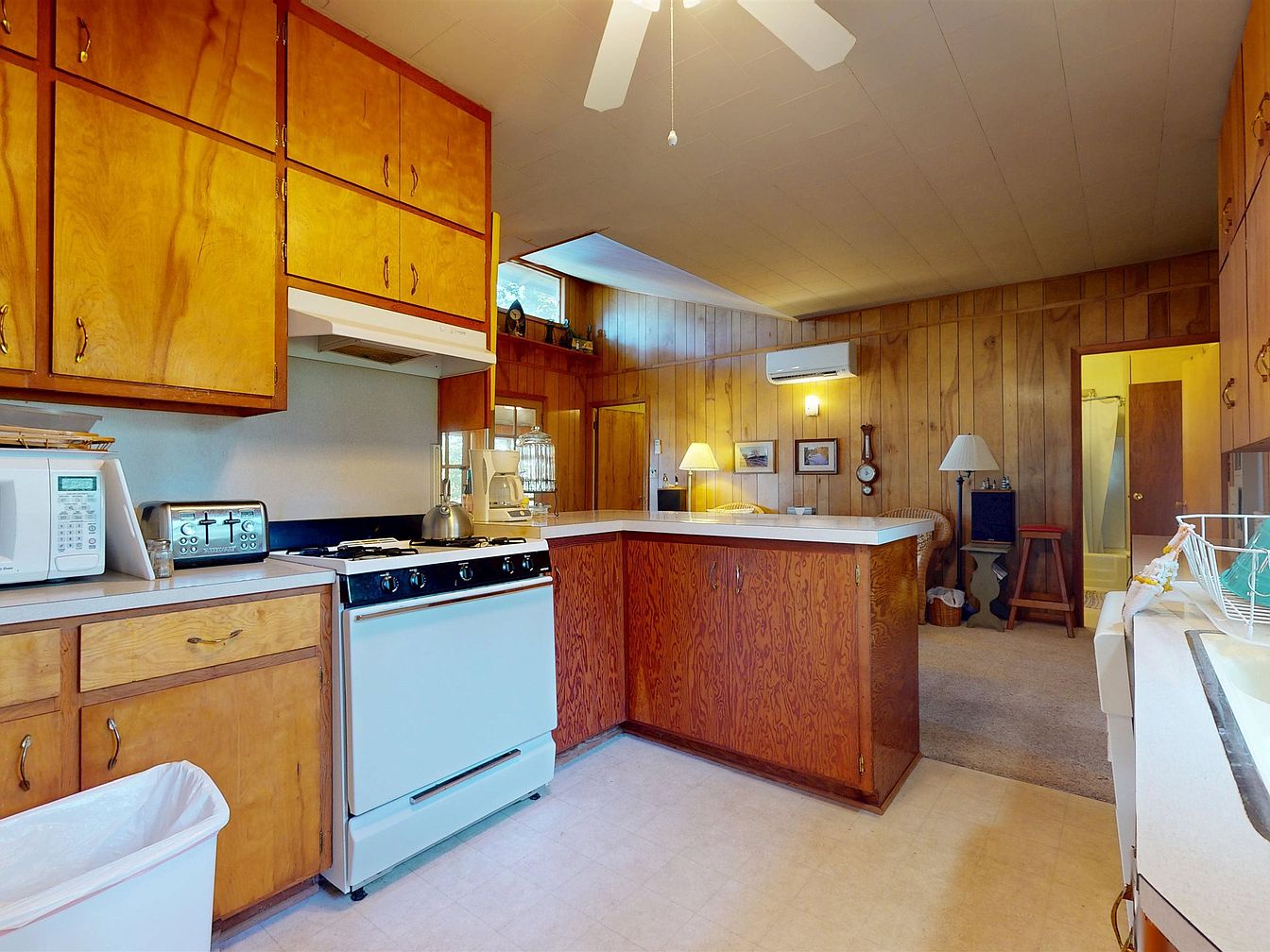 A mid-century kitchen features honey-toned wood cabinets and wood-paneled walls that continue into the adjacent living space, creating a warm and cohesive aesthetic. The countertops are a light laminate, contrasting with the retro white oven and range, toaster, and microwave. Upper cabinets provide substantial storage and feature brass hardware. The kitchen opens to a sitting area with a wicker chair, floor lamp, and modest wall art, separated by a partial counter. A ceiling fan hangs above, while an air conditioning unit is mounted on the paneled wall. The space is cozy, functional, and distinctly vintage in style.