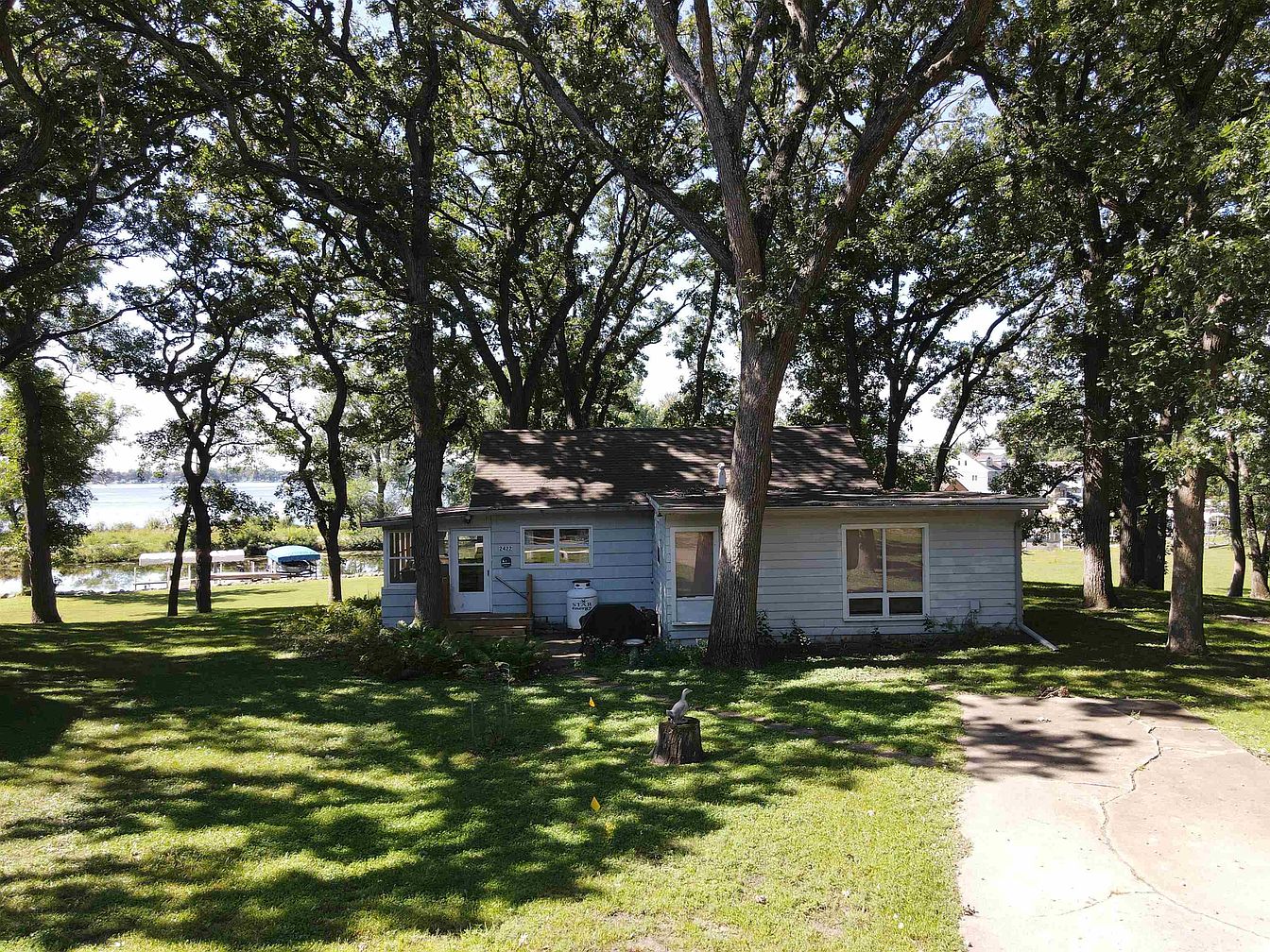 A charming, single-story house sits amid large, mature oak trees, casting dappled shade over a lush, green lawn. The home’s exterior is painted in a soft, weathered gray-blue, with simple white trim around the windows and door. A curved concrete pathway leads toward the entrance, bordered by subtle plantings and a small garden area near the base of the house. The setting feels serene, with a view of the lake and docks visible beyond the trees, embodying a peaceful lakeside retreat atmosphere with natural beauty and inviting outdoor space.