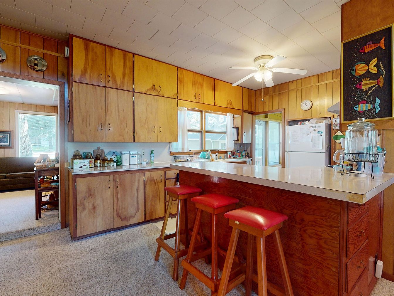 A cozy, mid-century kitchen featuring natural wood cabinetry that extends across the walls and above the countertops. The countertops are a light laminate, complementing the warm wood tones, while a peninsula with seating for three is outfitted with wooden stools topped by bright red vinyl cushions. The kitchen contains vintage decor with glass jars, a beverage dispenser, and a colorful fish-themed wall hanging. Light beige carpet covers the floor, continuing into the adjacent space, and large windows let in ample daylight. A white ceiling fan with lights and classic appliances add to the nostalgic, homey aesthetic.