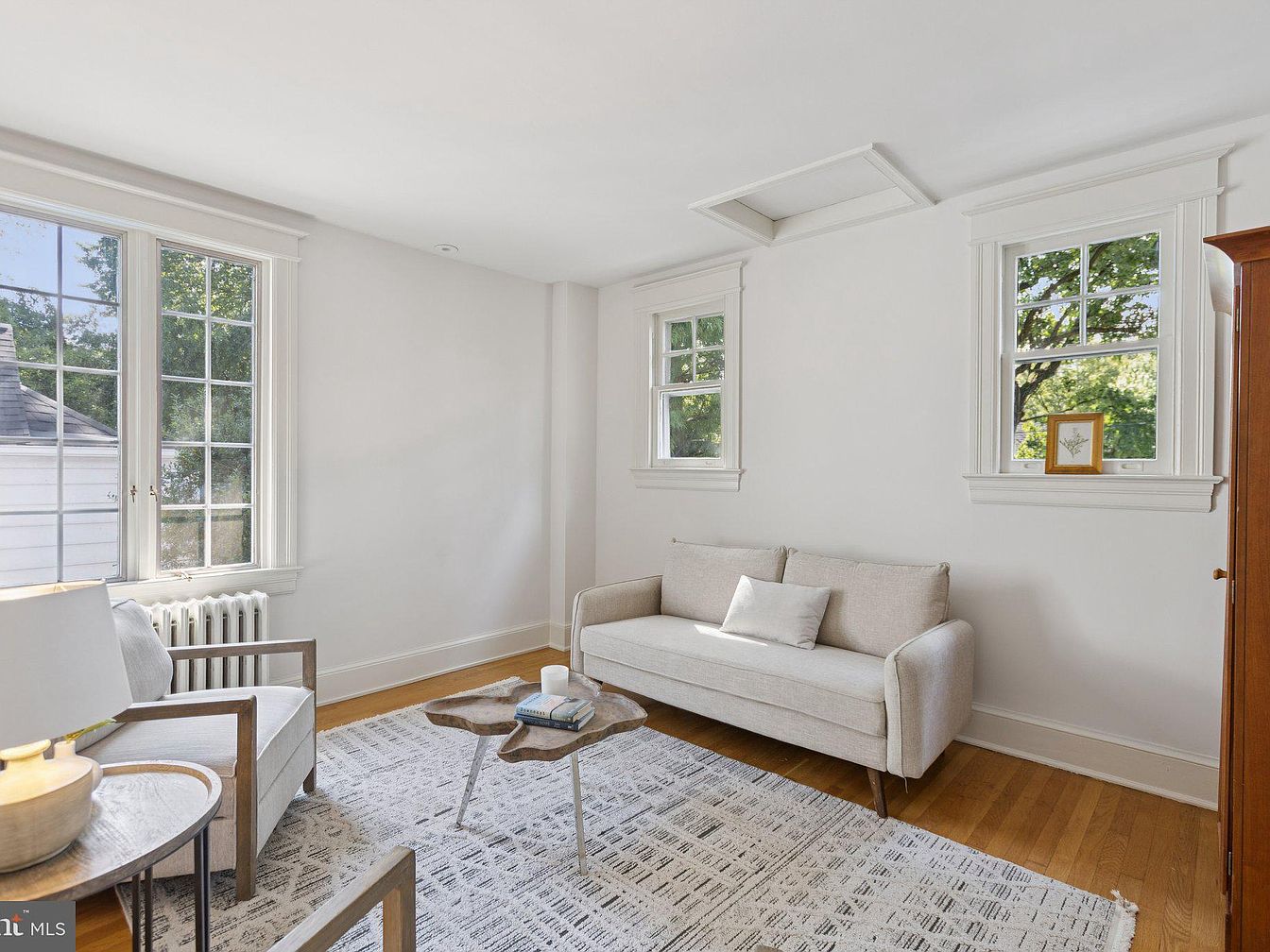 A serene living room featuring a layout that centers on simplicity and elegance. Light gray walls enhance the soft natural light streaming from large double-hung windows, framed with white trim. A pale, minimalist sofa rests against one wall, complemented by a cozy armchair, both arranged around a unique coffee table with an organic, natural wood design. A plush area rug in understated tones adds warmth underfoot. The room showcases a blend of modern and classic aesthetics, highlighted by a stylish table lamp and subtle decorative accents, creating an inviting atmosphere that balances comfort with refined design.