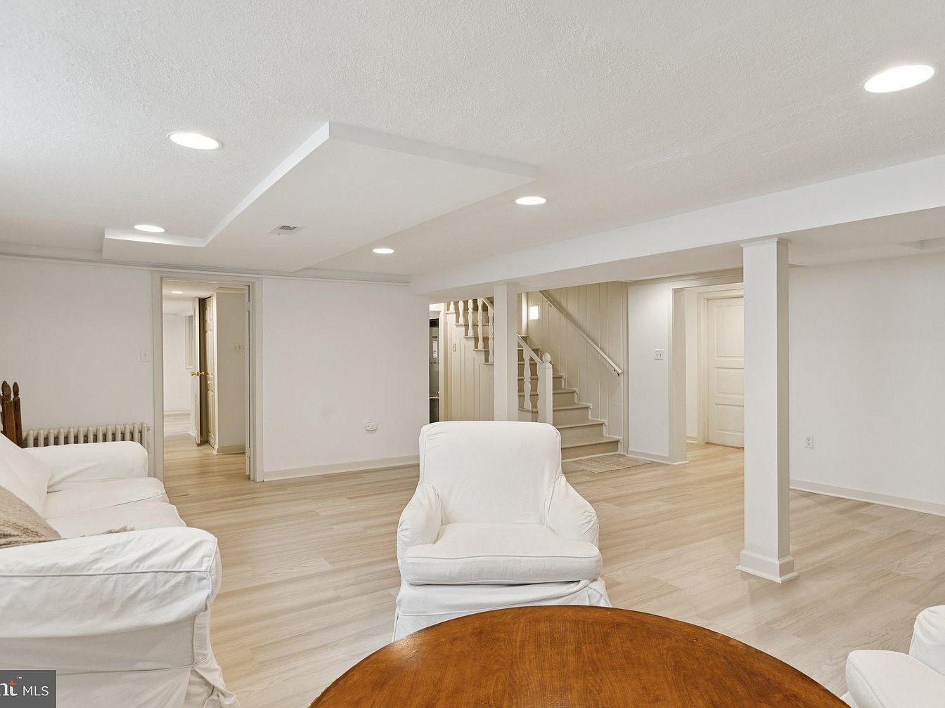 This basement lounge features a spacious layout with light wooden flooring that enhances the airy feel. Soft, white upholstered chairs are complemented by a round wooden table at the center, offering a cozy gathering spot. Recessed lighting on the ceiling illuminates the room, providing a modern touch against a neutral color palette. A nearby staircase with white balustrades leads to the upper level, suggesting easy connectivity. The room showcases minimalistic design elements, with a warm radiator visible on one wall, blending functionality with comfort. This space radiates a welcoming atmosphere perfect for relaxation or casual gatherings.