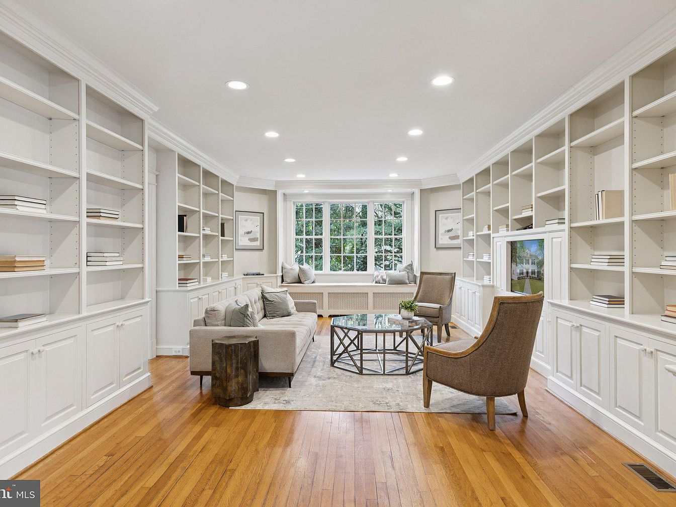 A spacious living room features built-in white bookcases that line two walls, accentuating the room’s height and providing ample storage. A large window reveals a picturesque view of the outdoors, allowing natural light to fill the space. Centered is a modern glass-top coffee table atop a subtle area rug, complemented by a streamlined sectional sofa in a neutral tone adorned with decorative pillows. Two elegant armchairs in a soft brown fabric offer additional seating. The warm wood flooring contrasts beautifully with the light walls, while recessed lighting and crown molding enhance the room’s sophisticated yet cozy ambiance.