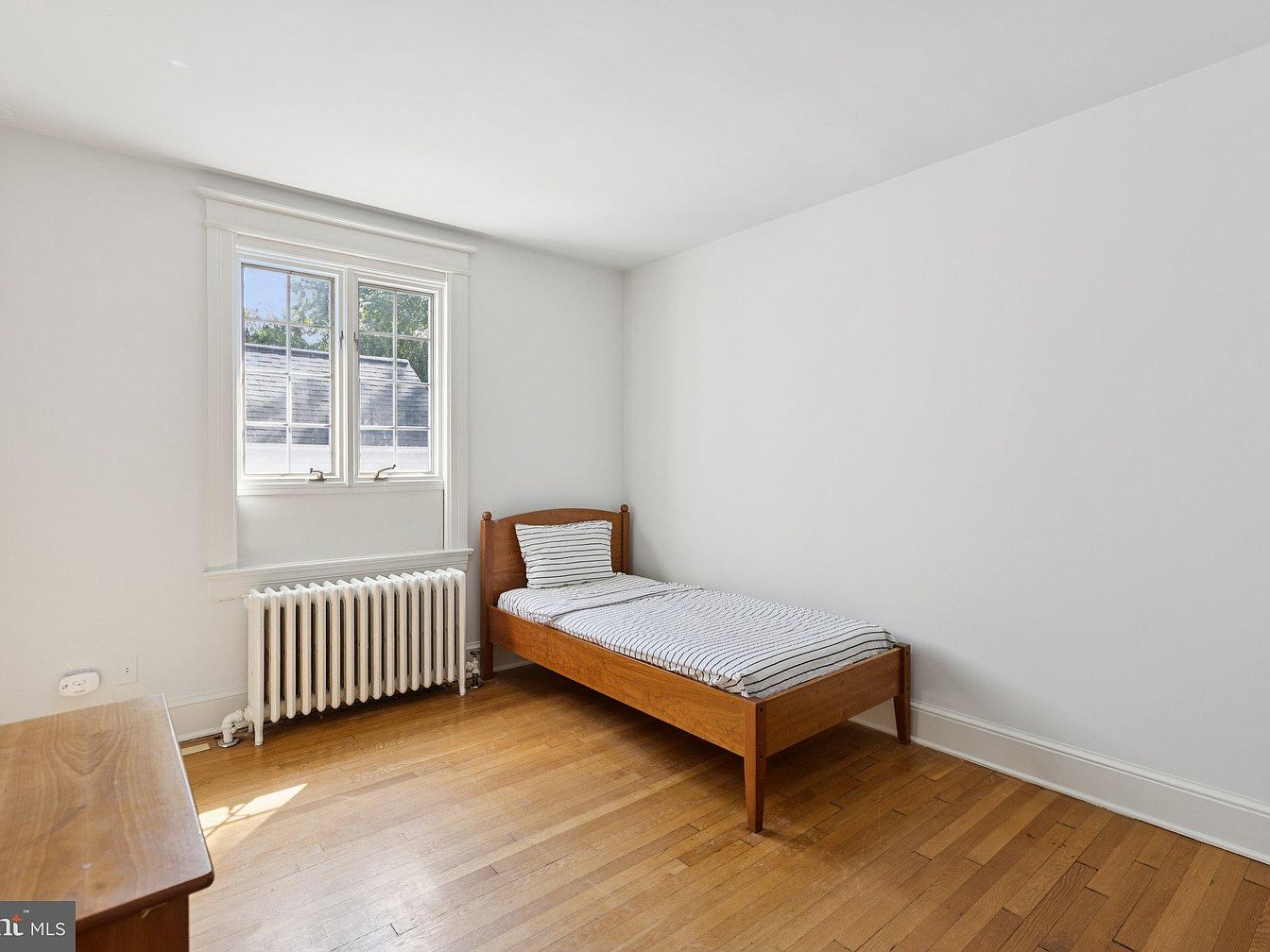 This cozy bedroom features a minimalist design with light-colored walls, emphasizing simplicity and serenity. A wooden bed with a striped mattress occupies one corner, providing an inviting focal point. The smooth, honey-toned hardwood floor complements the natural warmth of the wood elements in the space. A vintage-style radiator is situated beneath the window, which is framed by classic white trim and allows natural light to brighten the room. The overall aesthetic is calm and uncluttered, highlighting a harmonious balance between function and style, suitable for relaxation and restful sleep.