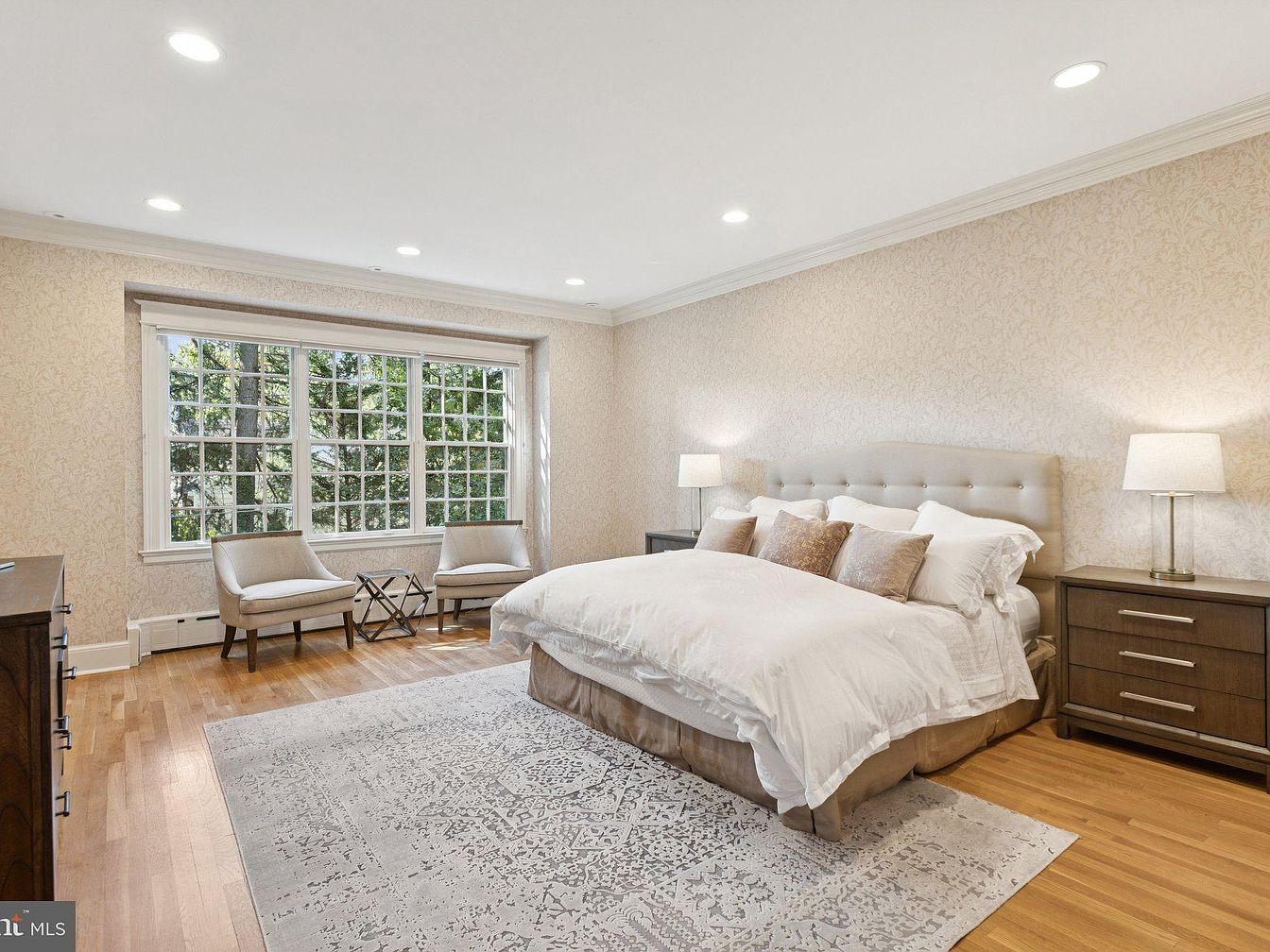 A serene bedroom featuring a large, plush bed dressed in crisp white linens and tailored pillows, complemented by a neutral bed frame. The light-hued wallpaper showcases a subtle floral design, enriching the space without overwhelming it. On either side of the bed, sleek nightstands support elegant lamps, adding warm lighting. Two comfortable chairs with soft upholstery sit across from the bed, arranged around a delicate metallic side table. The expansive window allows natural light to flood the room, offering views of greenery outside. Rich hardwood flooring and a textured area rug add warmth and depth, creating a cozy retreat.