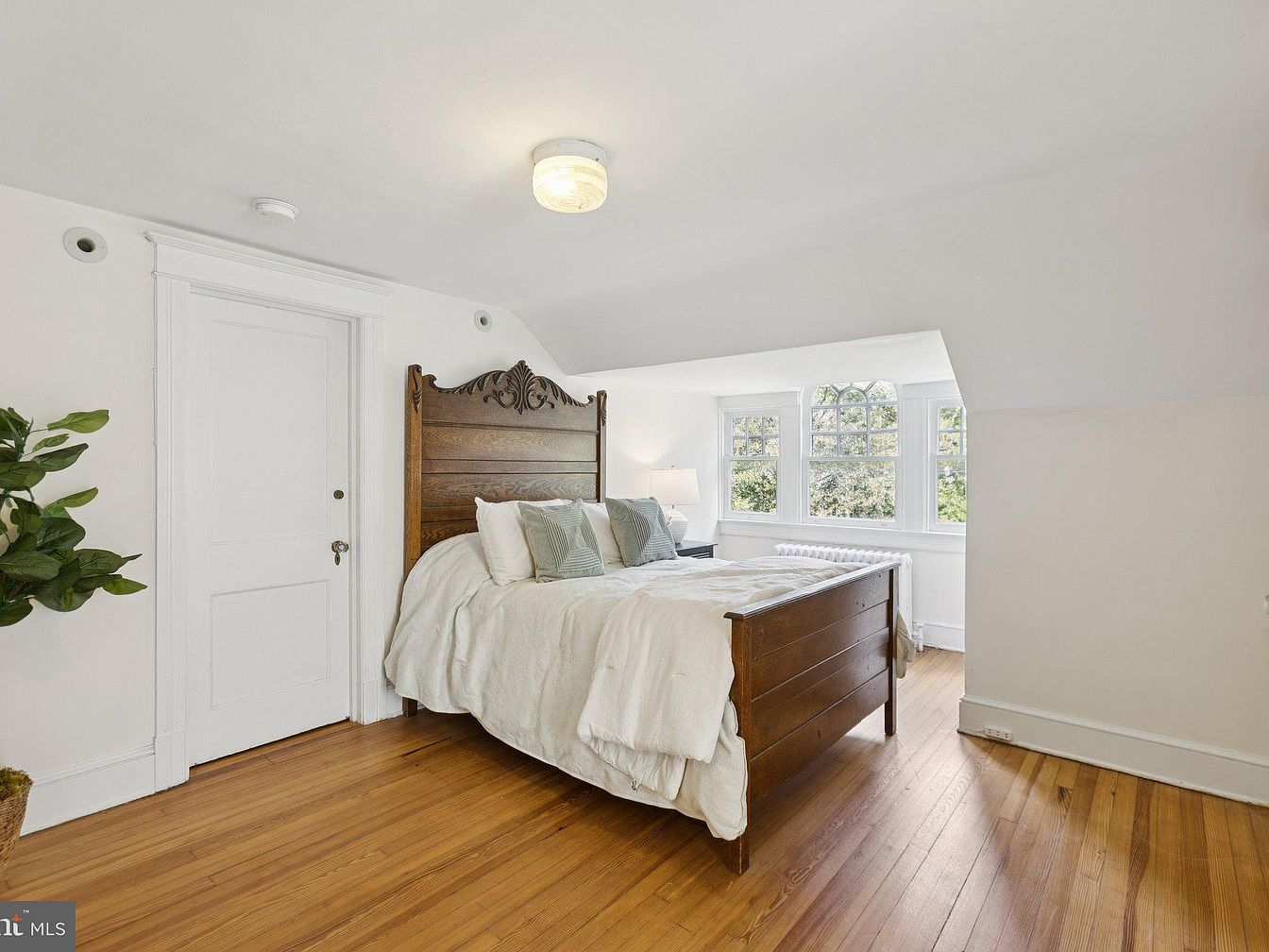 A cozy bedroom featuring a vintage wooden bed frame with an intricately carved headboard, giving the space a classic touch. Light-colored walls amplify the brightness, while large windows allow for ample natural light, bordered by white trim. A soft, white bedding set with decorative pillows contrast beautifully against the rich wood. The polished hardwood floors enhance the warmth, and a small potted plant adds a hint of greenery, bringing life to the space. The room incorporates both functionality and comfort, with a discreet door leading to another area, illustrating a classic American home aesthetic.
