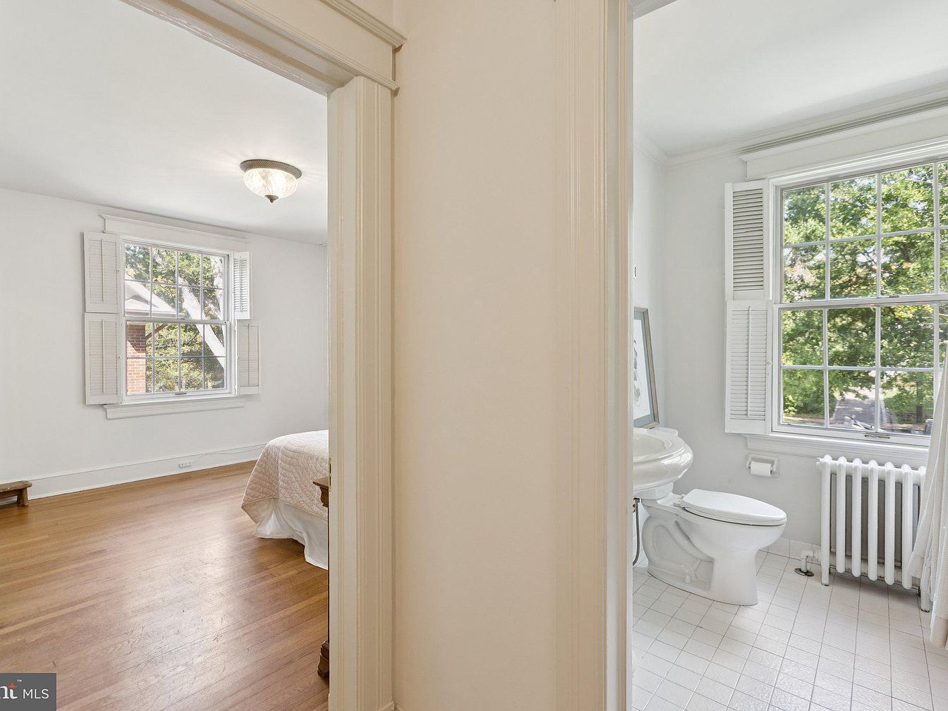 A bright and airy bathroom features classic, clean lines with a seamless transition through the doorway from a light-filled bedroom. The white walls and tiled flooring enhance the sense of spaciousness. A large window adorned with wooden shutters allows natural light to flood the area, illuminating a vintage-style pedestal sink and a white toilet. A sleek radiator sits beneath the window, adding warmth and character. The simplicity of the decor emphasizes the charming architectural details, such as the crown molding and the elegant light fixture overhead, creating a quaint yet functional space that retains historic charm.