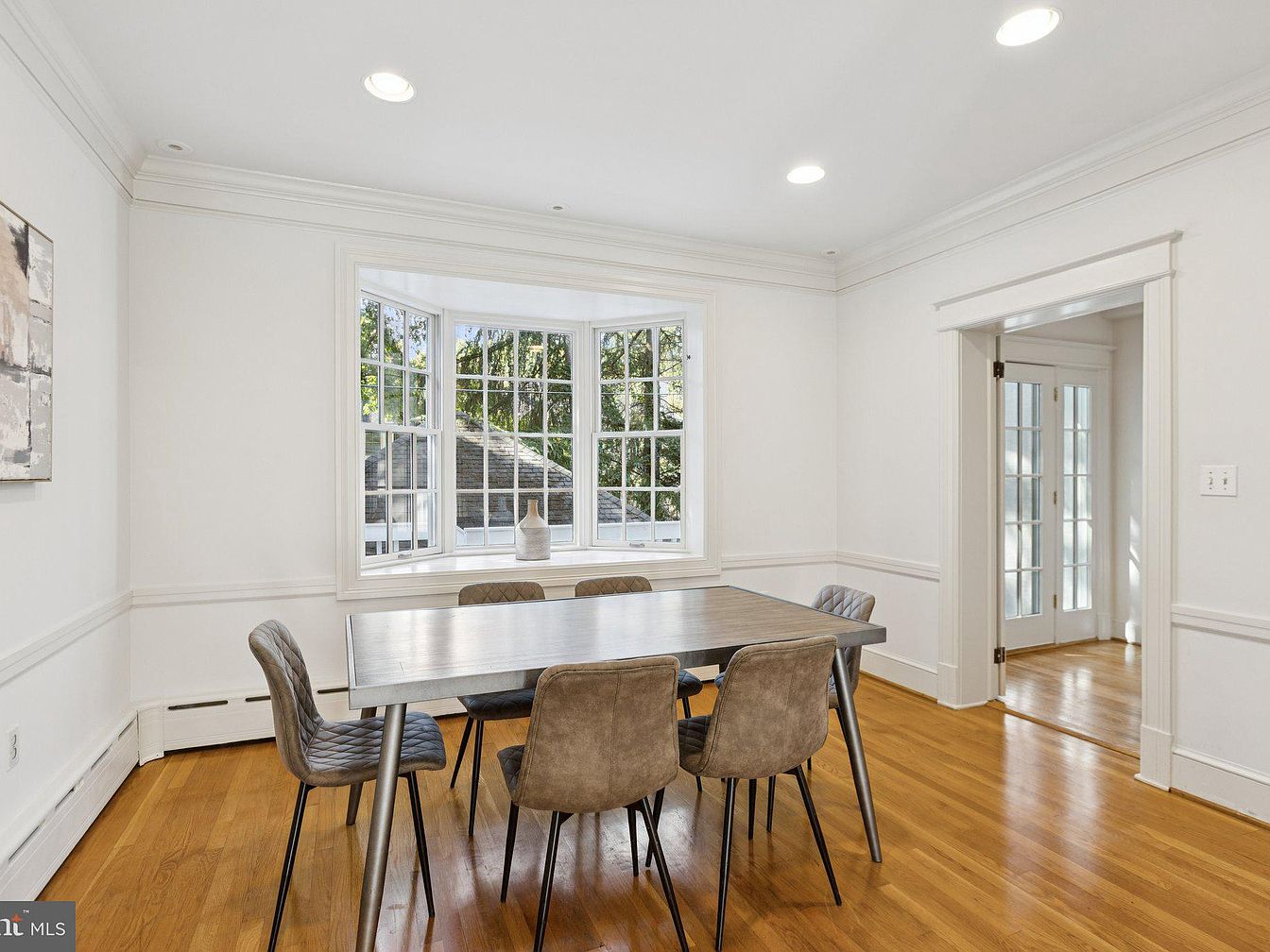 This spacious dining area features a sleek, rectangular table surrounded by upholstered chairs with soft gray tones. The room is illuminated by recessed lighting, enhancing the bright, inviting atmosphere. A large bay window allows natural light to flood in, highlighting the clean white walls and contrasting with the warm honey-colored hardwood flooring. Decorative molding runs along the ceiling and the lower wall, adding a touch of elegance. An abstract art piece adorns one wall, while a doorway on the right leads to other parts of the home, maintaining an open and airy feel.