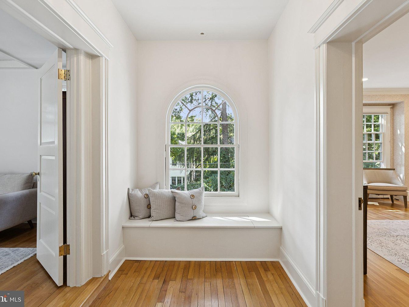 A bright entryway nook features crisp white walls and a large oval window framed in soft wood, allowing natural light to flood the space. A cozy built-in bench welcomes relaxation, adorned with two textured, buttoned pillows in neutral tones. Gleaming hardwood floors extend throughout, complementing the minimalist design with subtle warmth. Doorways on either side lead to adjoining rooms, maintaining an open, airy feel. Architectural details, such as molding around the windows and doors, add elegance while enhancing the historic character of the home, skillfully merging comfort with timeless style.