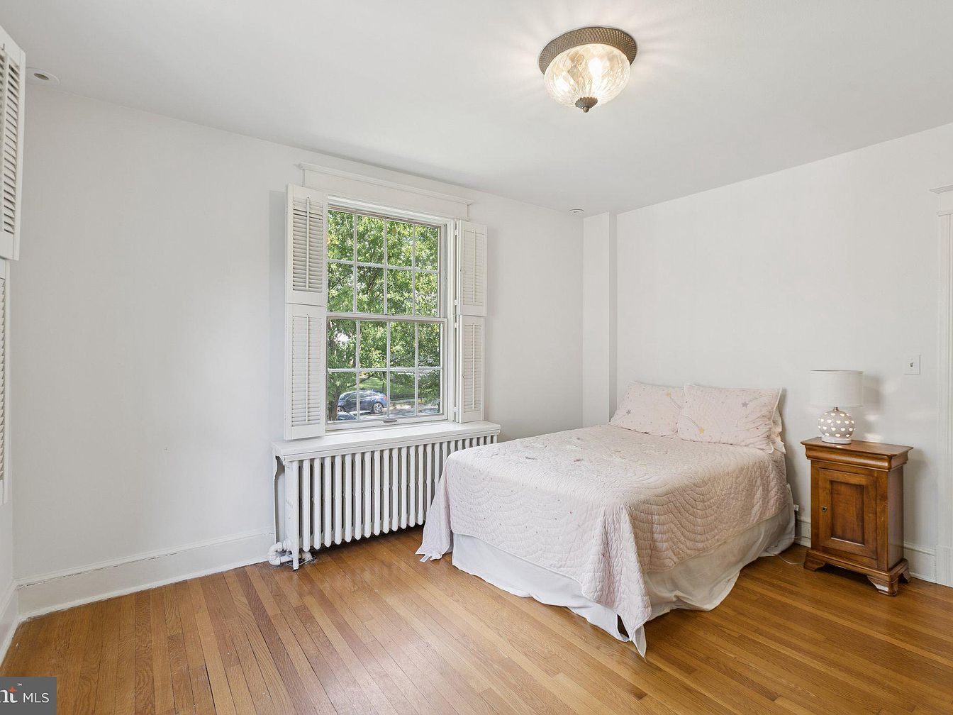 A bright and serene bedroom features a large window adorned with white shutters, allowing natural light to illuminate the space. The walls are painted a soft white, enhancing the room’s airy feel. A neatly made bed is dressed in a light pink quilt, complemented by matching pillowcases. To one side, a wooden nightstand holds a simple lamp with a decorative pattern, adding a touch of warmth. The room’s flooring consists of polished hardwood, creating a cozy atmosphere. Below the window, a vintage-style radiator adds character, blending functionality with the overall design aesthetic of the historic home.