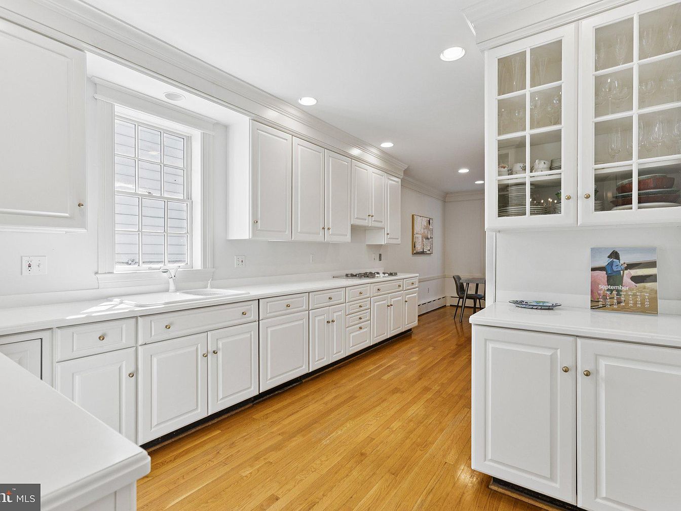 This kitchen features an elongated layout with sleek white cabinetry that reaches the ceiling, providing ample storage. The combination of polished white countertops and golden hardware adds elegance. A modern gas stove integrated into the countertop allows for seamless cooking. Throughout the space, recessed lighting enhances the bright atmosphere, complementing the rich, warm tones of the hardwood floor. To one side, glass-front cabinets showcase dishware, adding a visual interest. An open doorway in the background hints at an informal dining space, creating a sense of flow between areas. The overall aesthetic is clean, contemporary, and inviting.