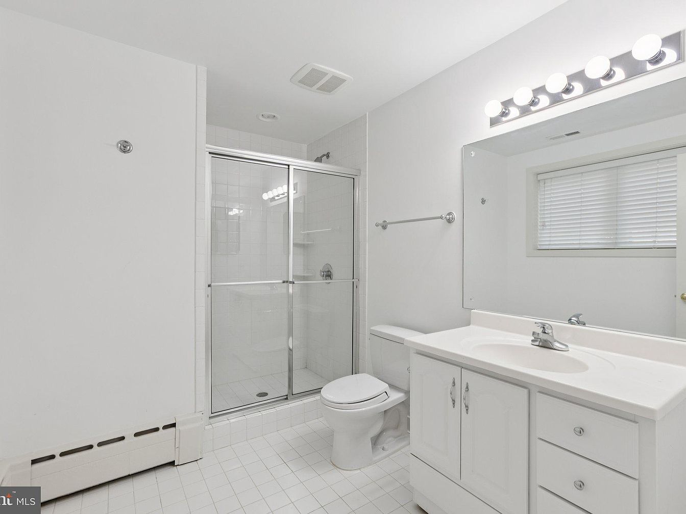 This bright bathroom features a clean and modern aesthetic with an all-white color scheme. The space is characterized by a spacious layout, showcasing a glass-enclosed shower and a sleek white vanity with brushed nickel fixtures. A large mirror enhances the room’s openness, reflecting the ample light from overhead vanity bulbs. The tile flooring is a subtle grid pattern, adding texture without detracting from the minimalist decor. A narrow window with blinds provides natural light while ensuring privacy. Functional elements like a towel rack and sufficient cabinetry complete the room, optimizing both style and utility.