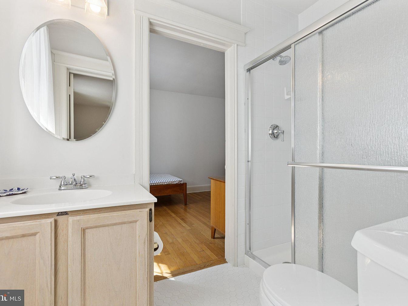 A bright, modern bathroom featuring a circular mirror above a simple white sink. The cabinetry showcases light wood with a natural finish, harmonizing with the light-colored wall tiles and floor. A clear glass shower enclosure reveals sleek chrome fixtures and minimalistic design. Directly across, a partially visible room hints at an inviting ambiance, with warm wood flooring and a neatly made bed. The overall color scheme of soft whites and earth tones enhances the spacious feel, while natural light pours in, creating a fresh, clean aesthetic that promotes tranquility and comfort.