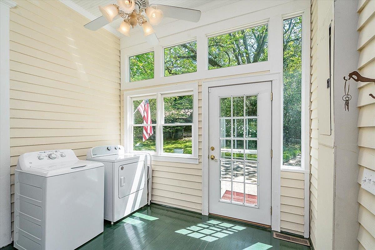 A bright, sun-filled laundry and mudroom area features creamy yellow beadboard walls and a deep green painted wood floor. The room includes a white washing machine and dryer placed side by side against the left wall. A glass-paneled door framed with multiple windows opens to a lush green yard visible through the glass. Overhead, a ceiling fan with five lighted glass shades provides light and ventilation. Brass hardware accents the door, and hooks for keys are mounted on the right wall. The abundance of natural light and crisp color palette give the space a clean, welcoming atmosphere.